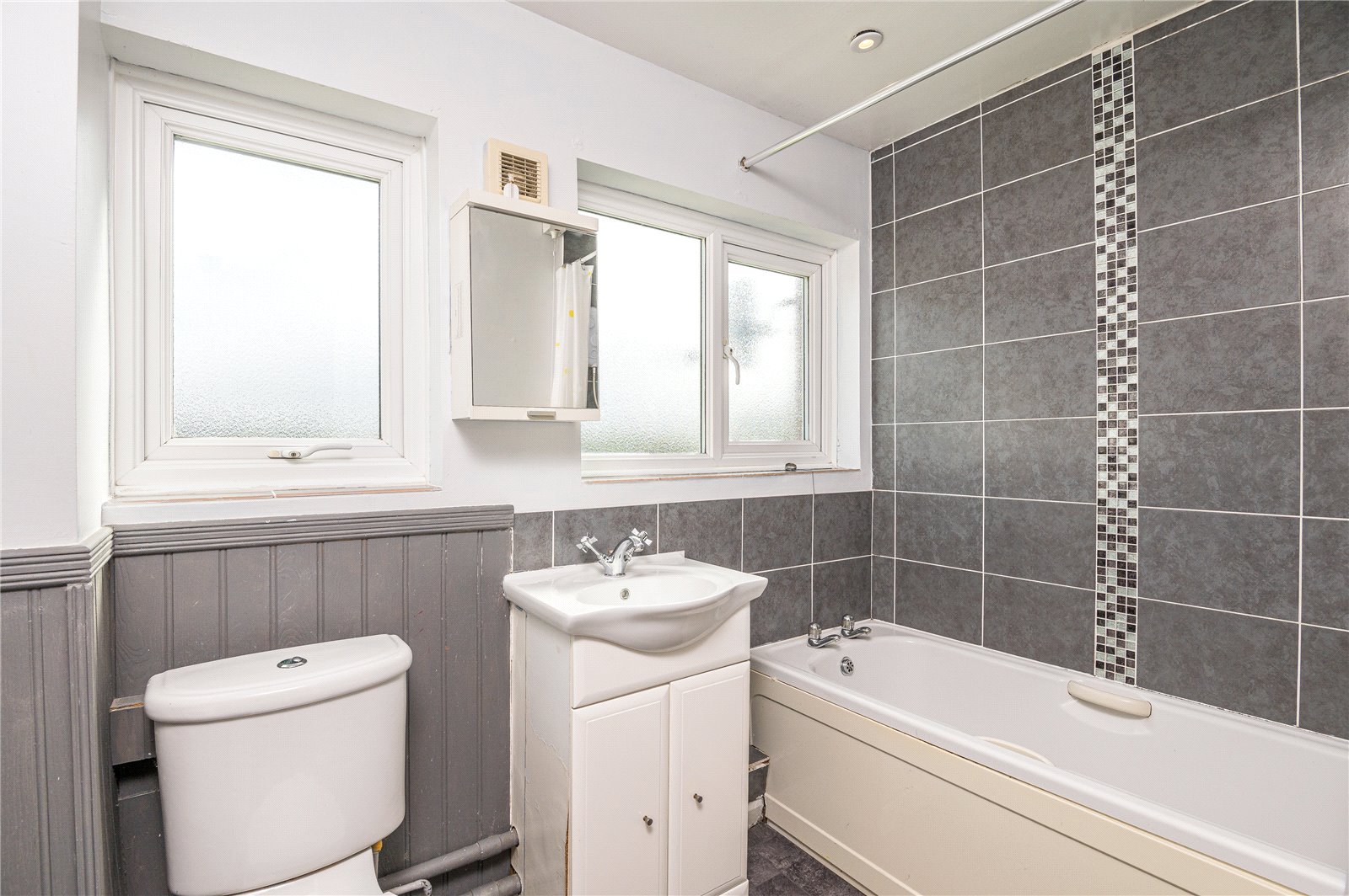 Two obscure uPVC double glazed windows to rear. Fitted with a three piece suite comprising panel enclosed bath with handgrips and independent Tritan electric shower above, vanity wash handbasin with storage cabinet, and dual flush close coupled WC. Tile effect vinyl flooring. Full tiling to shower area with inset glass mosaic vertical tiles. Feature panelling to dado height. Smooth plastered ceiling with recessed LED lighting.