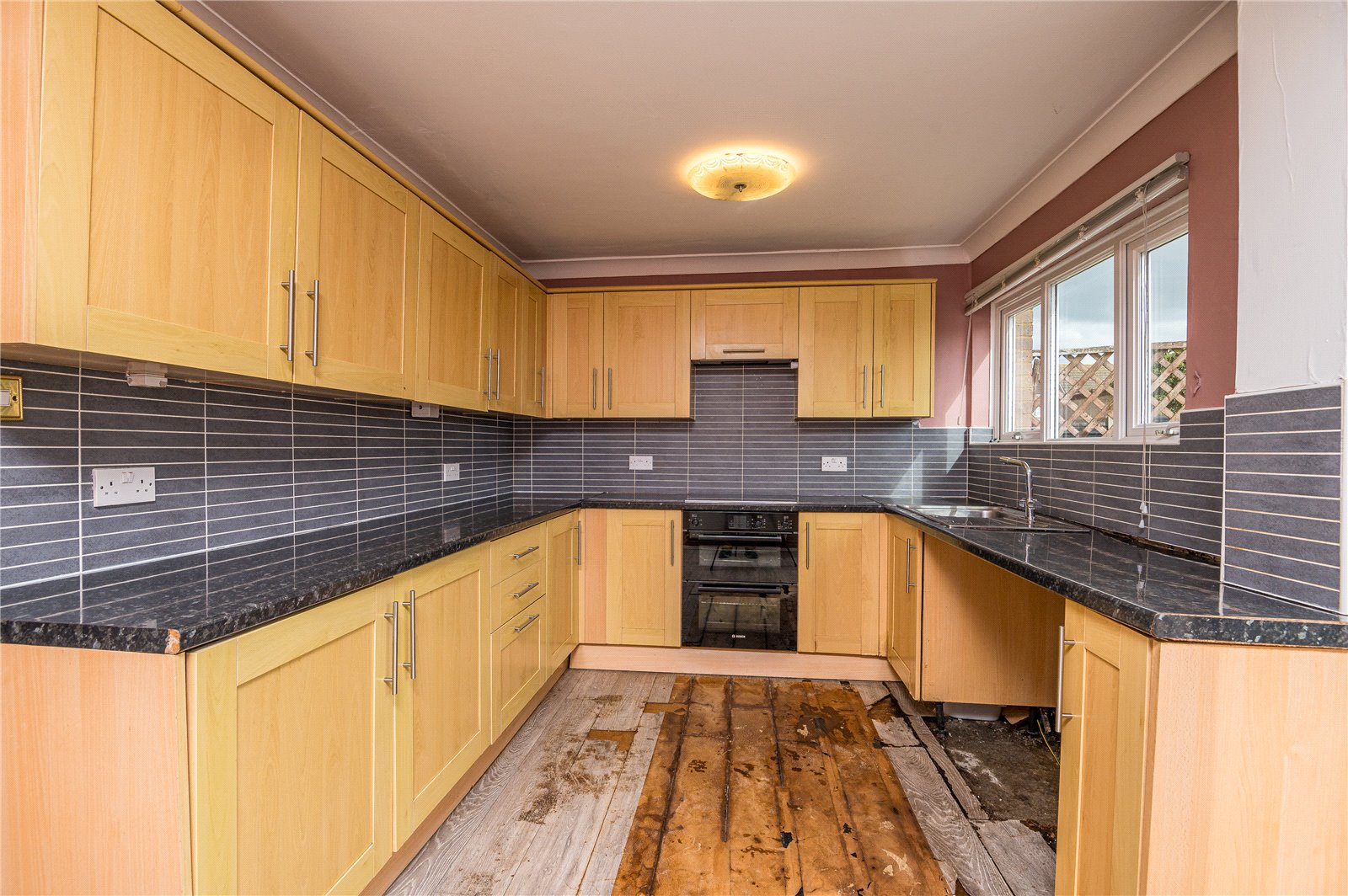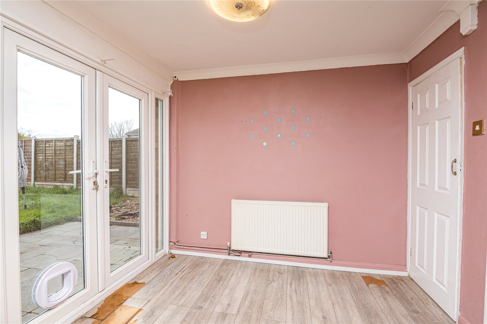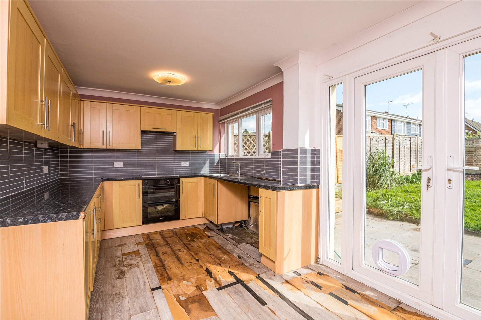 Upvc double glazed French doors give access to the south-facing rear garden with matching full height side panels, uPVC double glazed window to rear. The kitchen is fitted with a comprehensive range of base and pelmetted eyelevel cabinets in contemporary oak shaker style units with rolled edged working surfaces and inset stainless steel sink unit with mixer tap. Integrated one and a half fan assisted electric oven with four ring halogen hob and concealed extractor canopy above. Contemporary tiled splashbacks to all working surface areas. Radiator. Space for refectory table. Access to understairs storage cupboard housing meters and trip switch box with courtesy light. Coved cornice to smooth plastered ceiling.