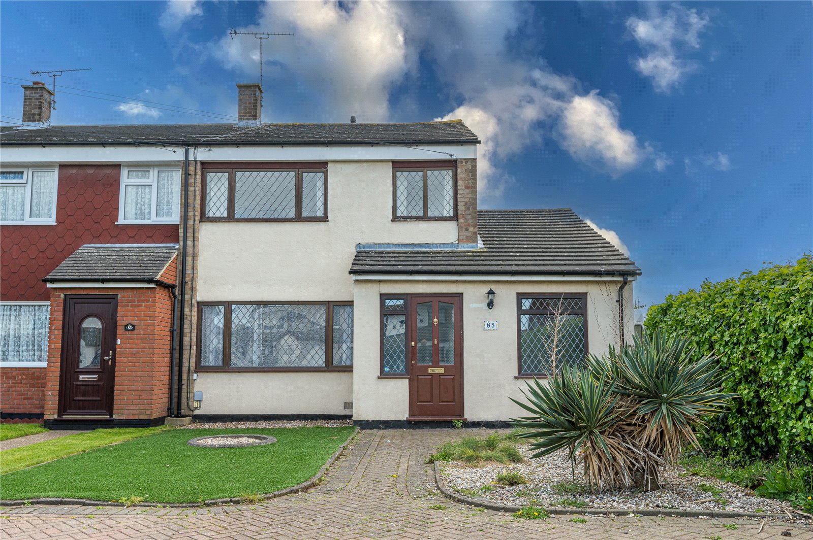The front of the property has a triple width herringbone brick block paviour private driveway and a matching footpath that leads to the entrance, with adjacent artificial lawned garden and shingled planted garden with hedged side boundary.