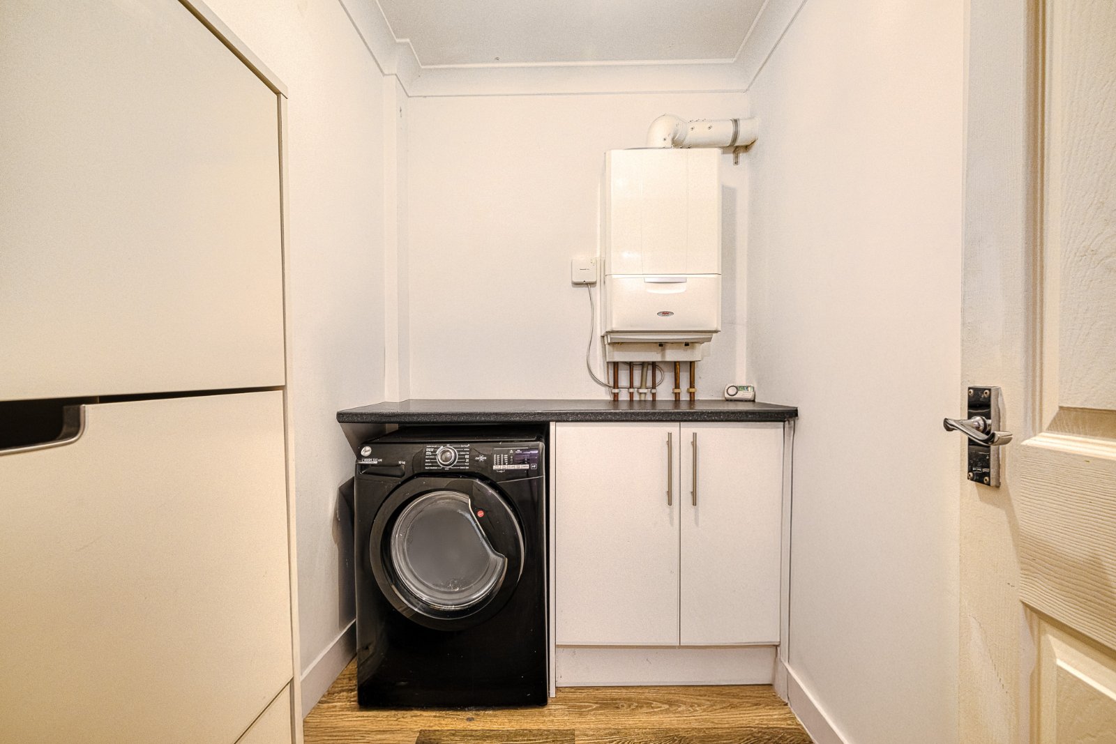 Fitted to one aspect with working surfaces providing recess space for washing machine and tumble dryer. Larder-style cupboard with shelving. Wall-mounted boiler. Finished with wood-effect flooring, radiator, and coving to the smooth plastered ceiling inset with recessed lighting.