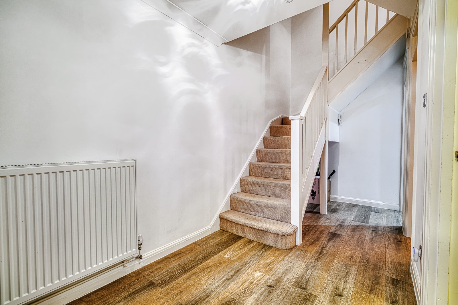 A welcoming entrance hallway featuring a turned staircase rising to the first-floor accommodation with spindle balustrade and useful understairs storage cupboards. Doors lead to the Utility Room, Kitchen and Ground Floor Guest Cloakroom/WC. Finished with wood-effect flooring, radiator, coving to the smooth plastered ceiling, and a further panelled door opening into: