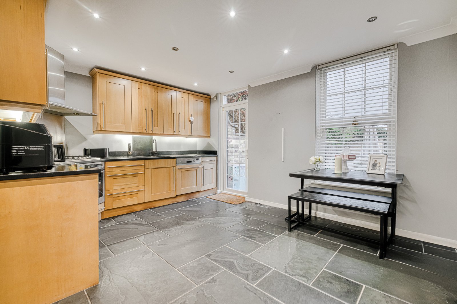 Pair of uPVC double glazed leaded sash-style windows to the rear aspect, with a matching glazed door adjacent providing access to the rear garden. The Kitchen is fitted with an extensive range of eye and base level units with granite working surfaces and matching upstands, inset with a stainless steel single bowl sink unit with mixer tap over. Appliances include a ‘Neff’ five-ring gas hob with stainless steel splashback and extractor canopy over, built-in ‘Neff’ low-level double oven and integrated dishwasher. Ample space for ‘American style’ fridge freezer and seating. Finished with tiled flooring, radiator, and coving to the smooth plastered ceiling inset with recessed lighting.