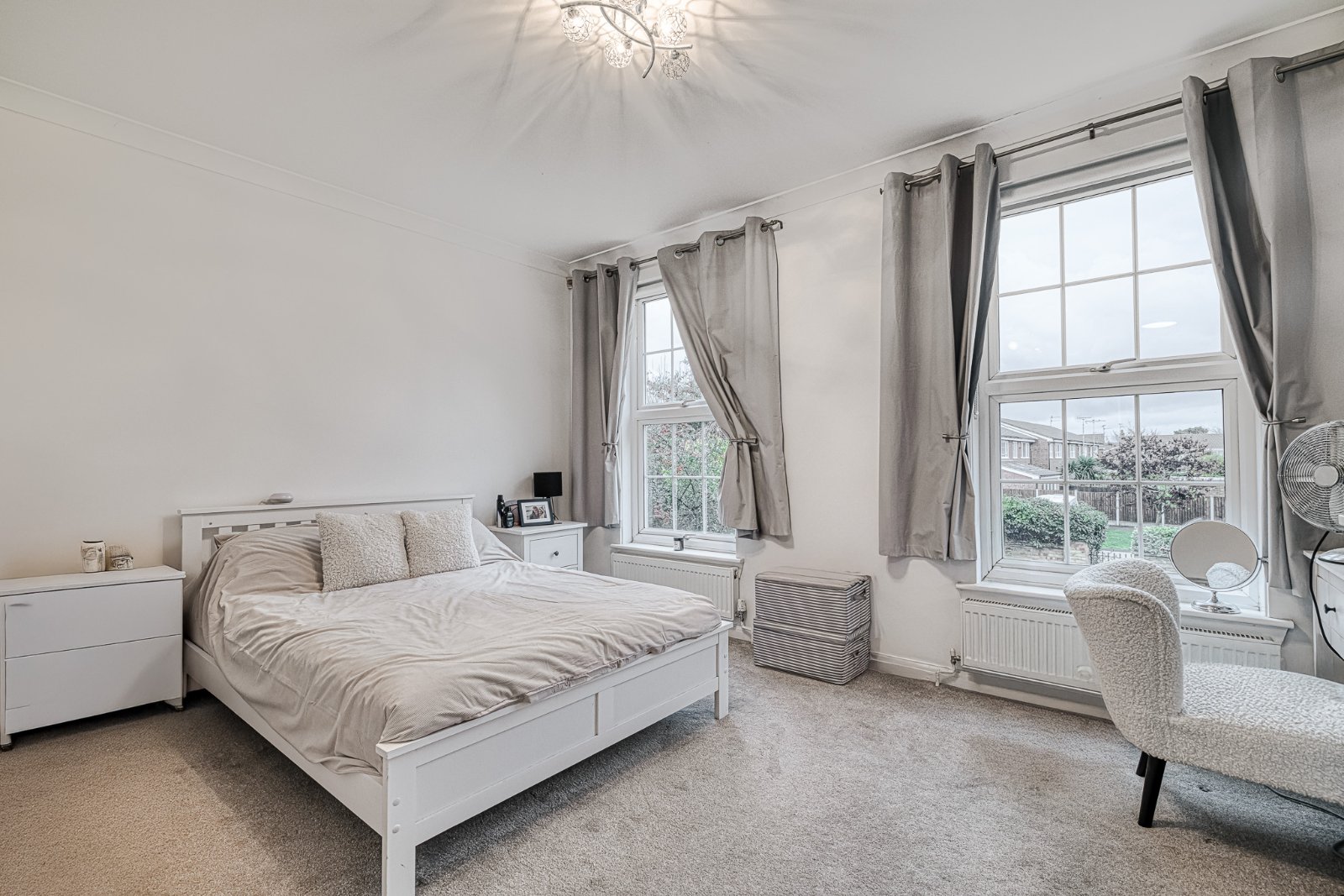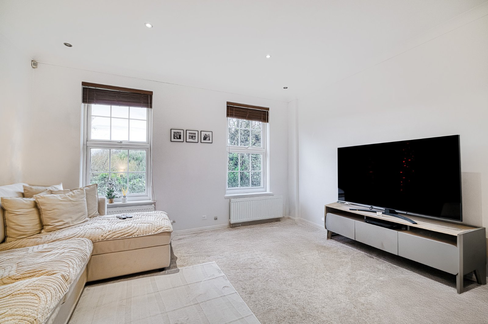 Pair of uPVC double glazed leaded sash-style windows to the westerly front aspect, offering superb views across the greensward. Two radiators and a wall-mounted thermostat control panel. Finished with coving to the smooth plastered ceiling inset with recessed lighting.