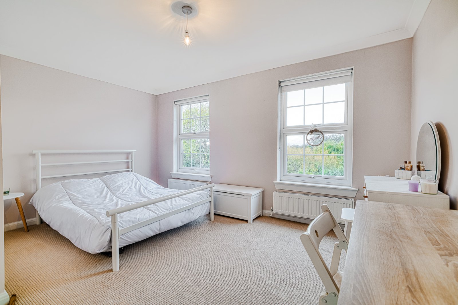 Pair of uPVC double glazed leaded sash-style windows to the westerly front aspect, offering lovely elevated views across the greensward. Two radiators. Panelled door to spacious recessed storage cupboard/wardrobe. Coving to smooth plastered ceiling.