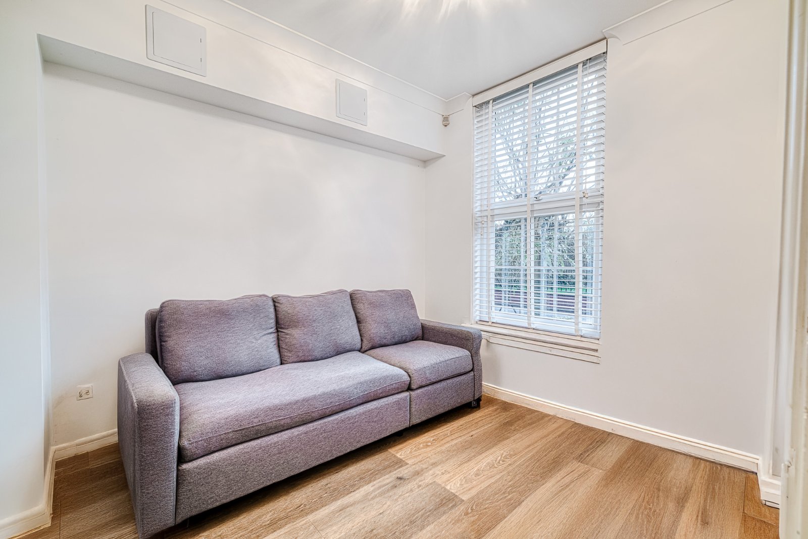 uPVC double glazed 'Georgian style' window to the front aspect, offering pleasant views across the greensward. Finished wood-effect flooring, radiator, and coving to smooth plastered ceiling.