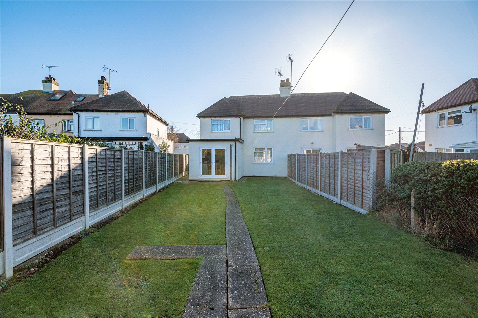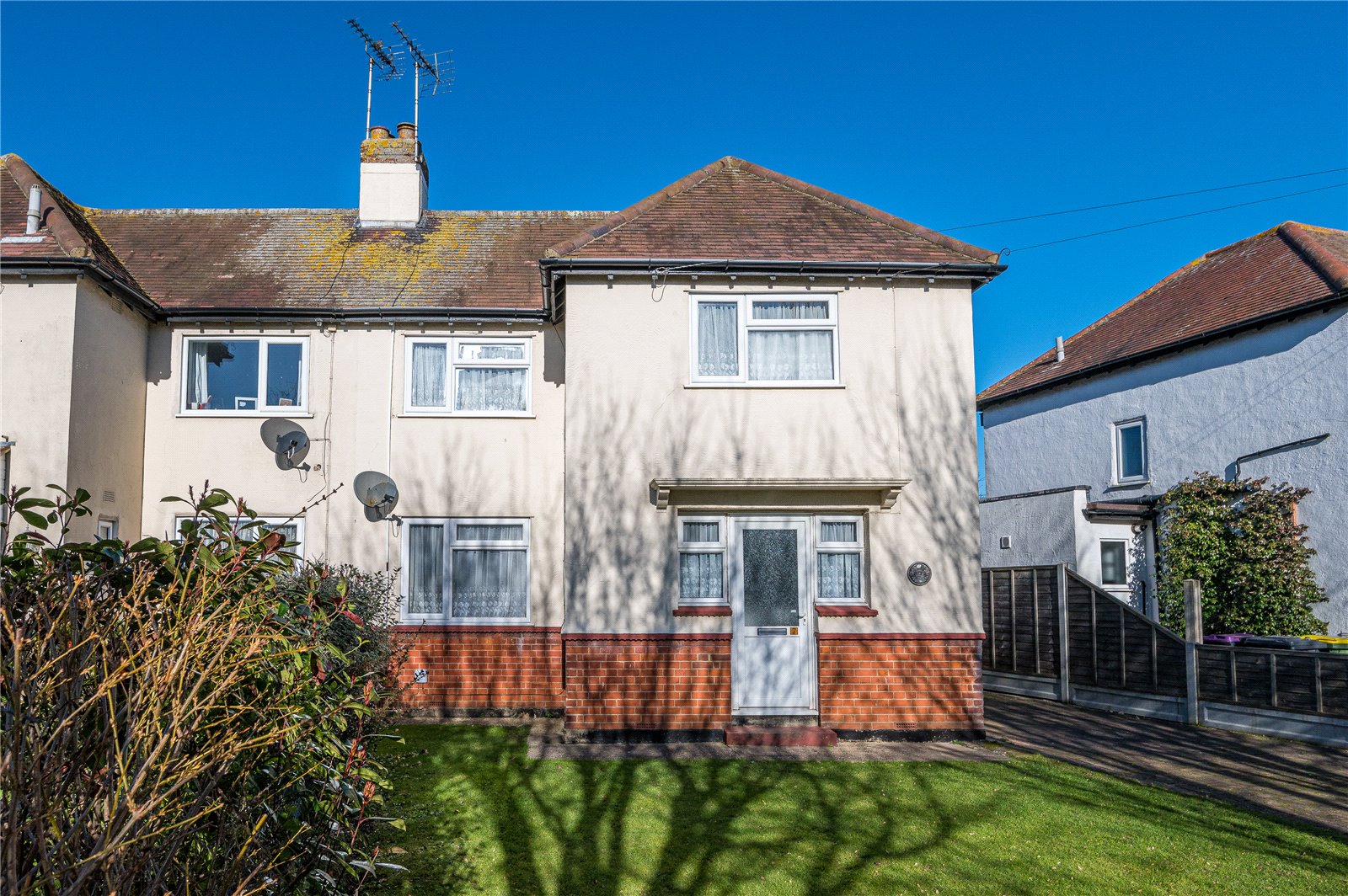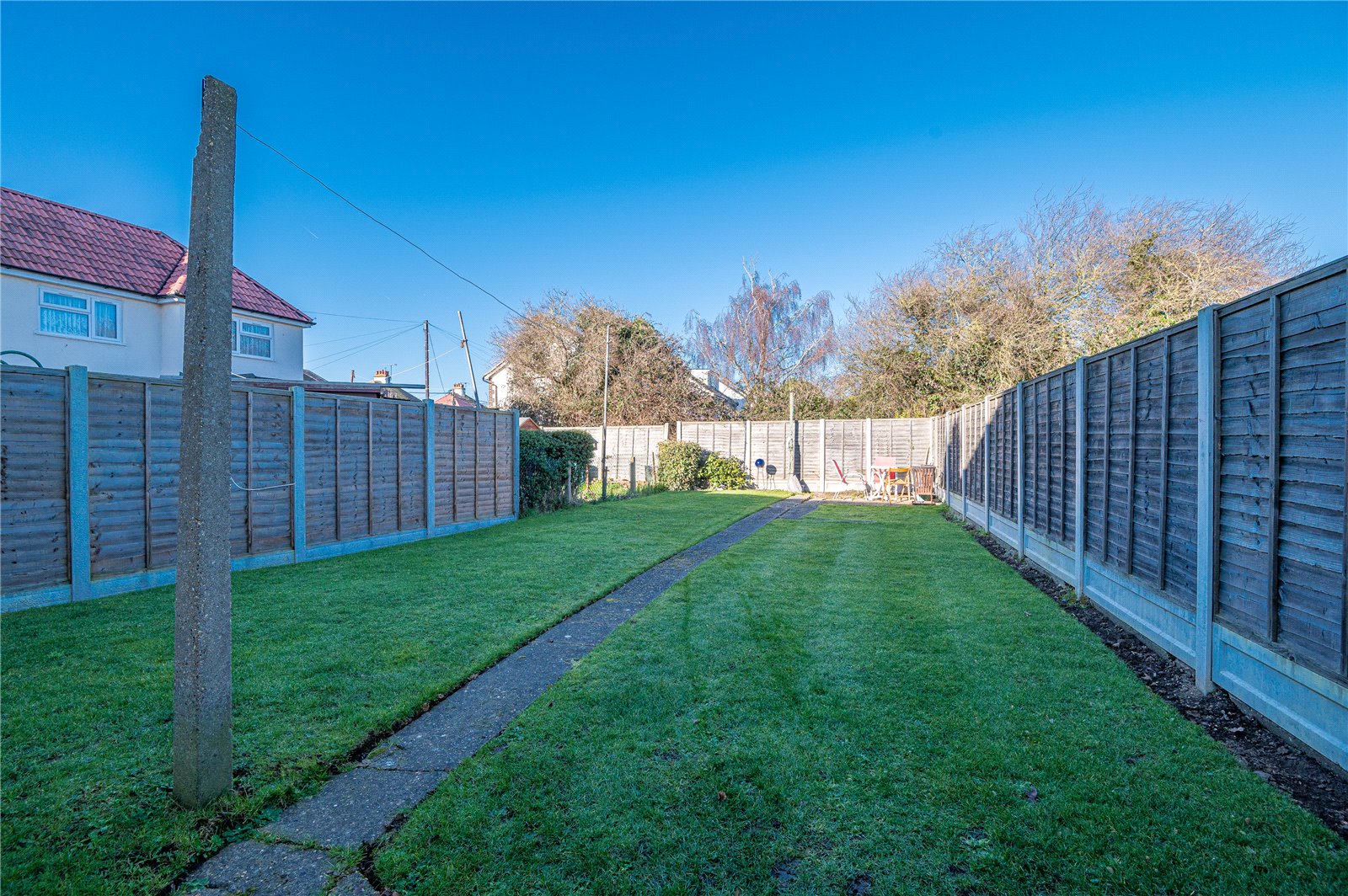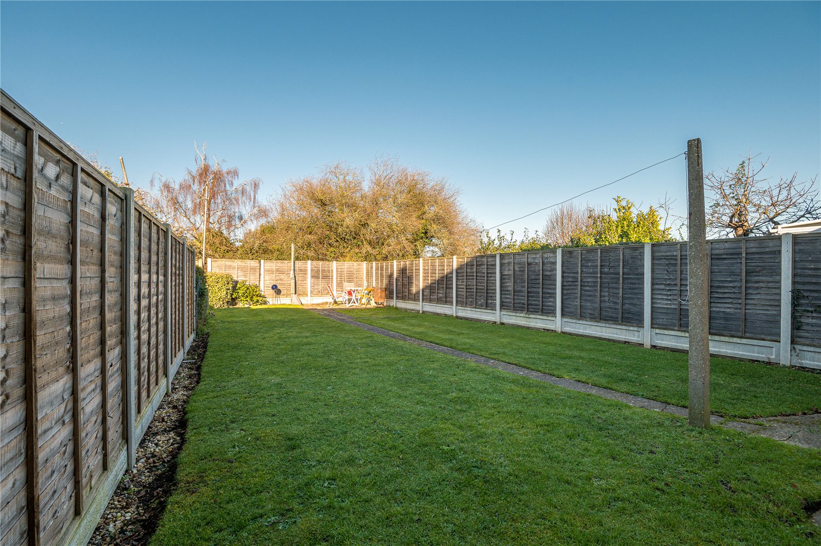 The rear garden measures circa 55’ and commences from the kitchen/dining room with a hardstanding area, with an extending footpath that leads to a further suntrap patio to the rear of the garden. Fencing to sides and rear boundary. An open sideway has a herringbone brick block paviour footpath leading to the independent driveway.