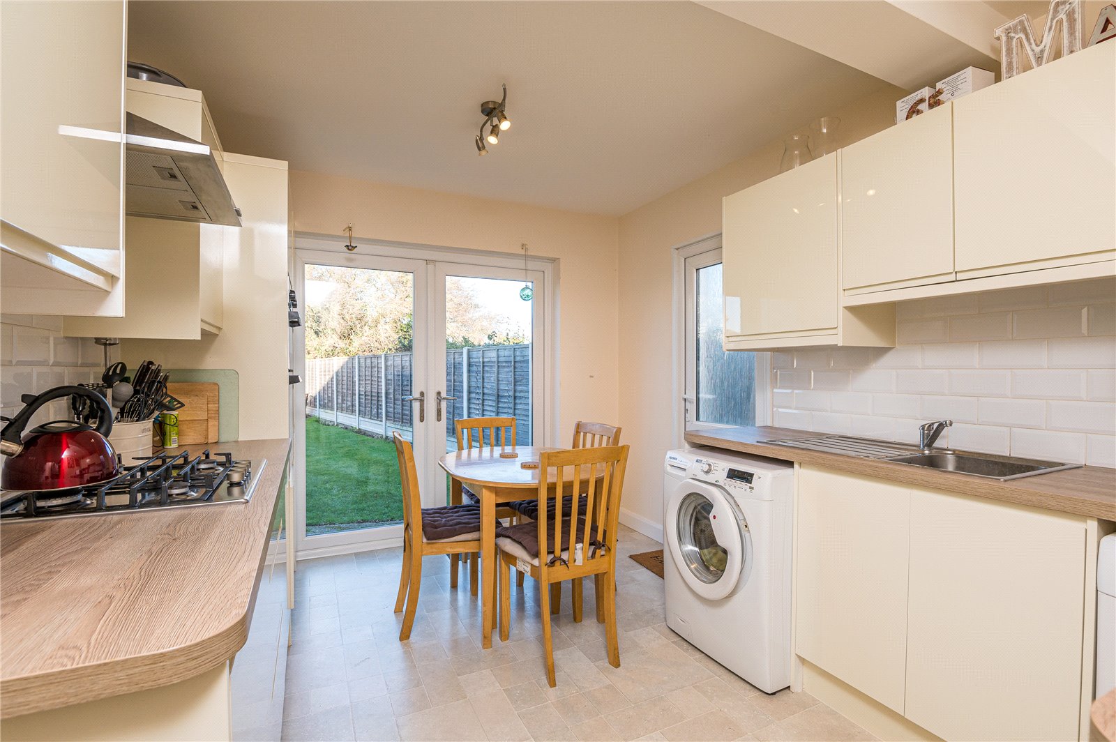 A dual aspect room, with Upvc double glazed French doors giving access to the rear garden, and an obscure Upvc double glazed door giving side access to the driveway. The kitchen has been professionally planned and fitted with a comprehensive range of base and pelmetted eyelevel cabinets in frameless gloss cream with squared edged oak effect working surfaces and inset stainless steel sink unit with mixer tap. The range of integrated appliances includes split level one and a half fan-assisted electric oven with four-ring gas hob, and contemporary brushed steel extractor canopy above. Space, plumbing and drainage for automatic washing machine and tumble dryer. White metro tiled splashbacks to all working surface areas. Space for a refectory table. Smooth plastered ceiling.