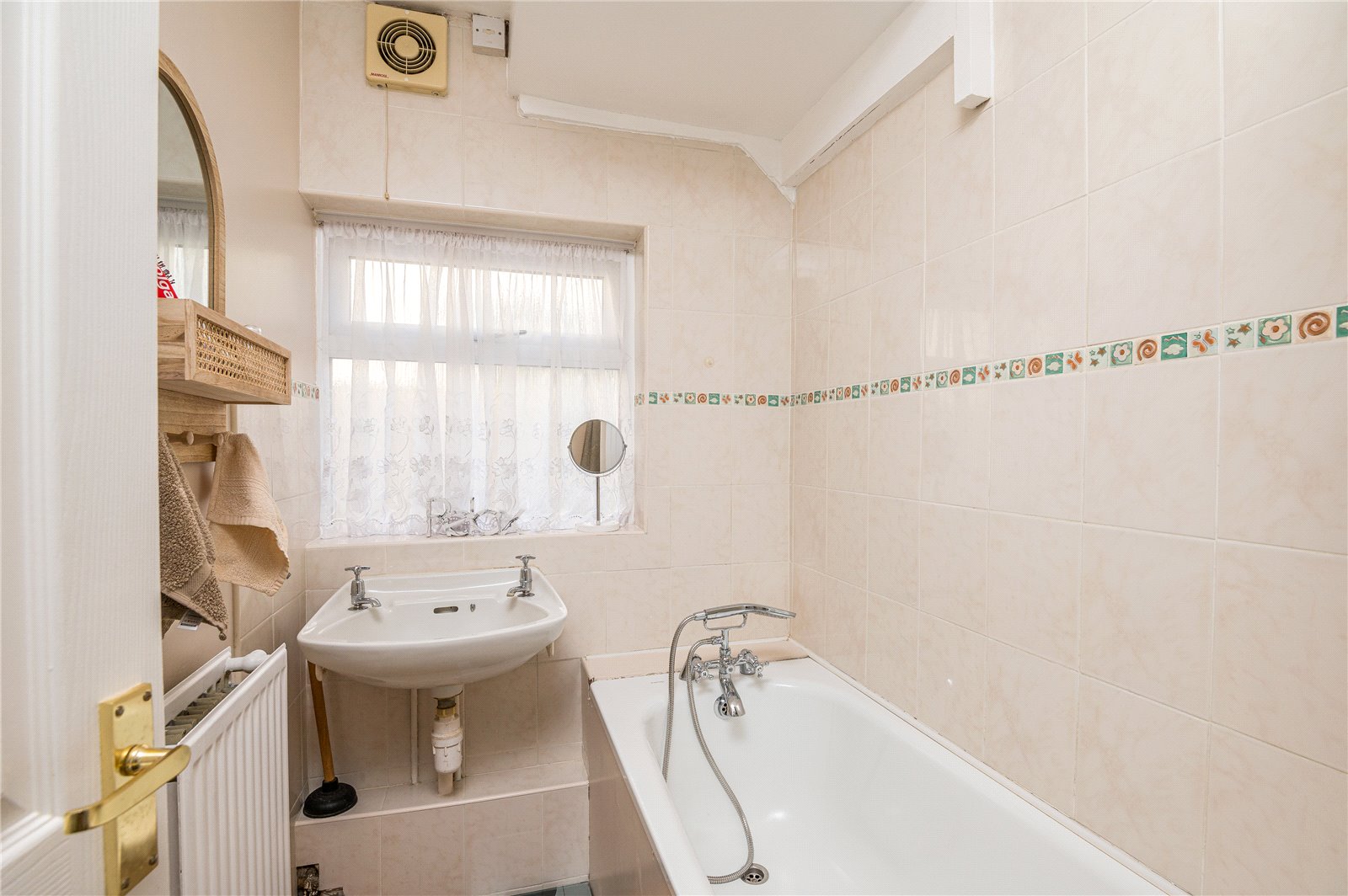 Obscure Upvc double glazed window to side. Parquet effect flooring. Double bank radiator. Fitted with a panel enclosed Ariston bath with contemporary chrome mixer tap and shower attachment, and suspended wash handbasin. Full tiling to the bath area with inset border tiles, and half height tiling to partial remainder. Extractor fan. Smooth plastered ceiling. Drop light switch.