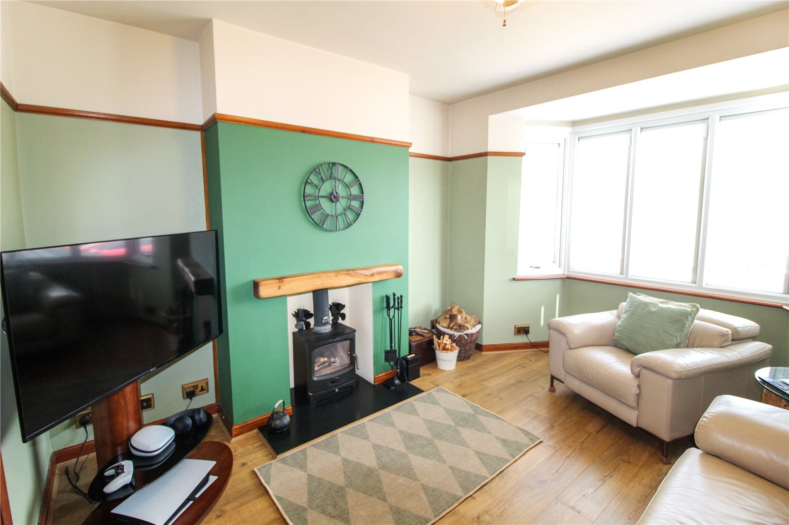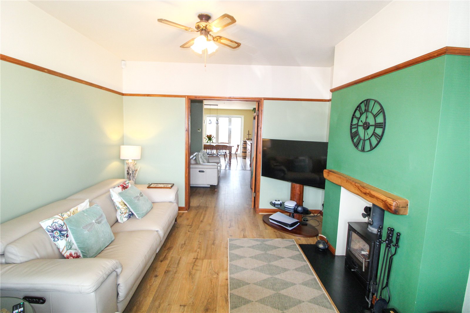 uPVC double glazed bay window to front fitted with integral blinds. Wooden flooring, skirting, log burner, picture rail, ceiling fan light.