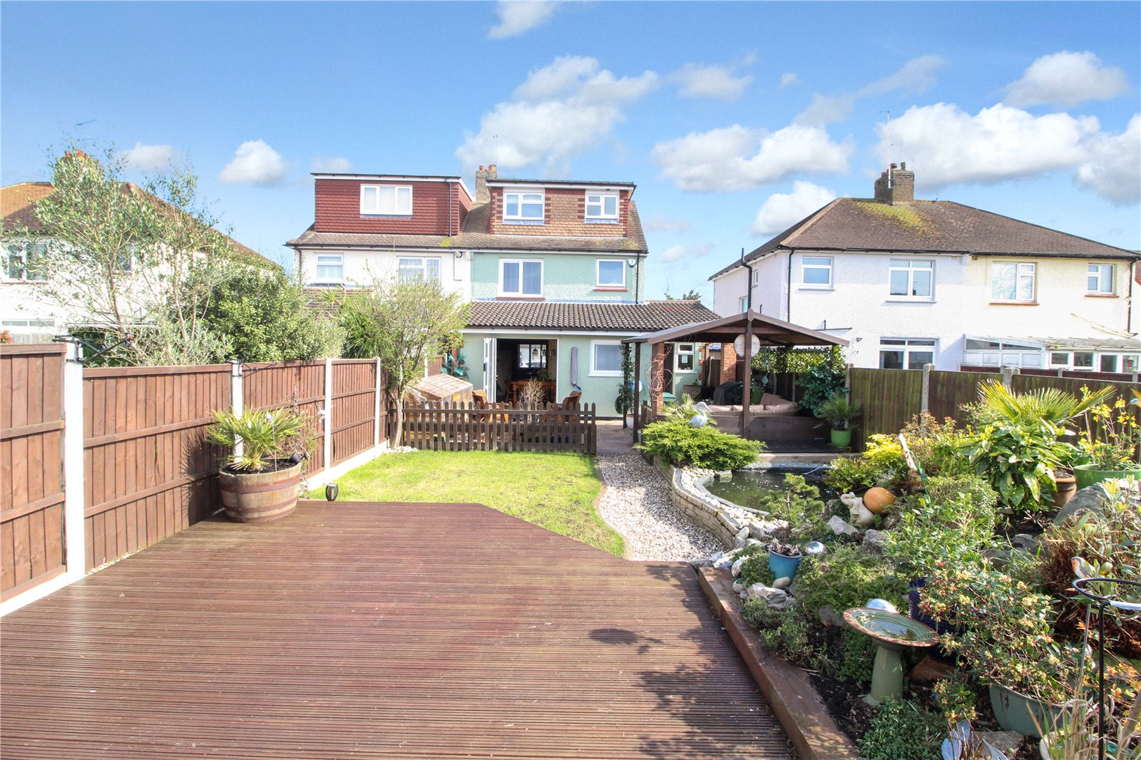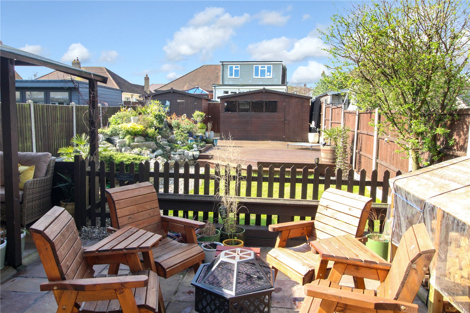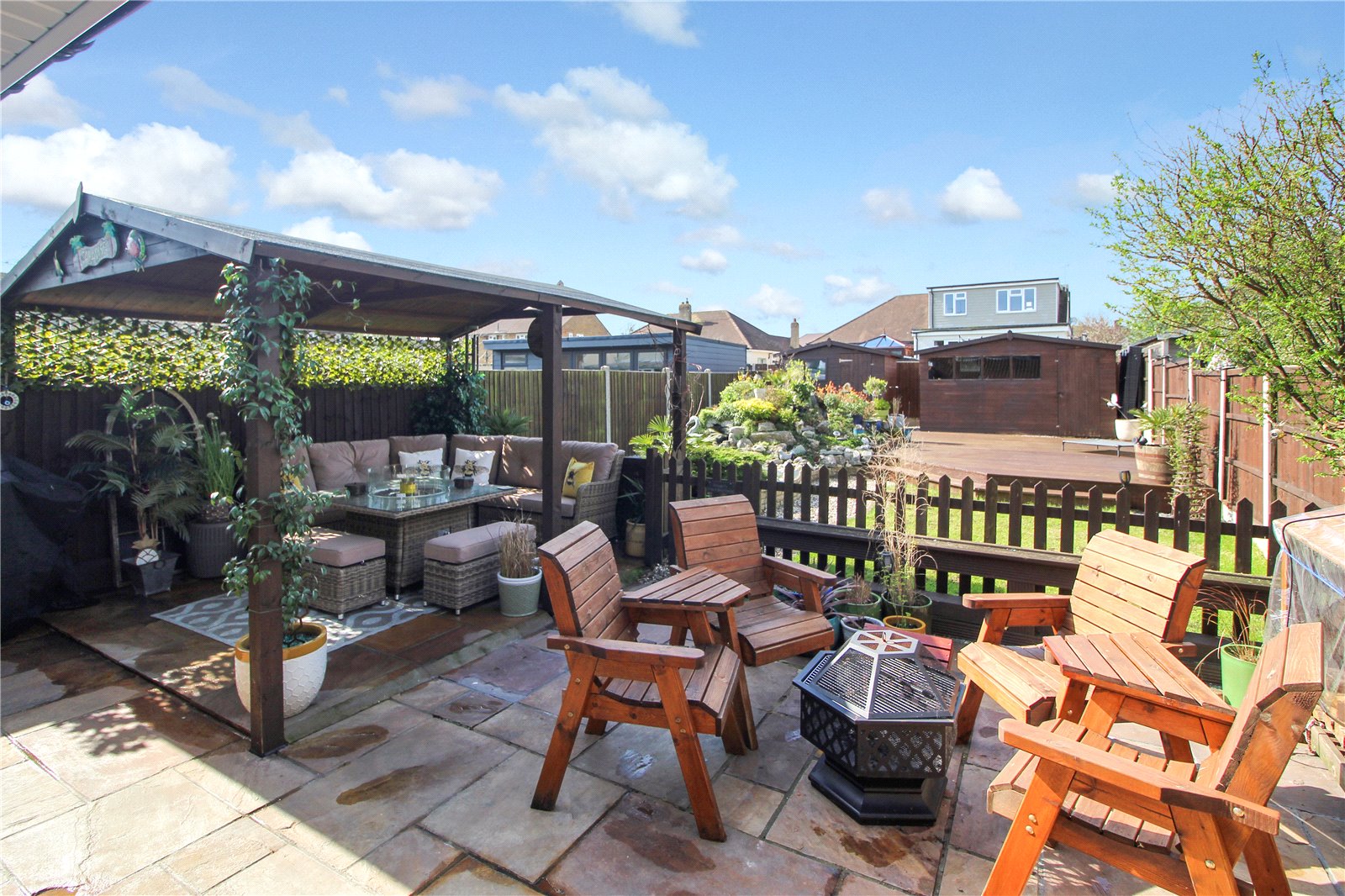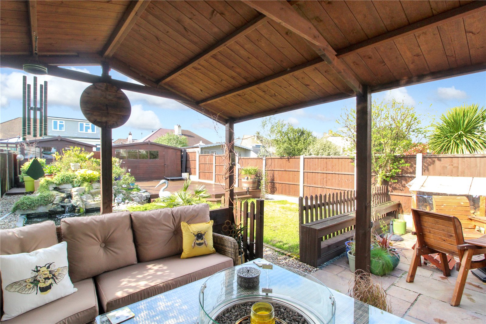 Beyond the seating areas, the West-backing rear garden is laid to lawn with a shingle path running alongside a rockery, beautifully arranged and housing various koi carp. The rear of the garden provides a large, decked area leading to two large storage sheds.