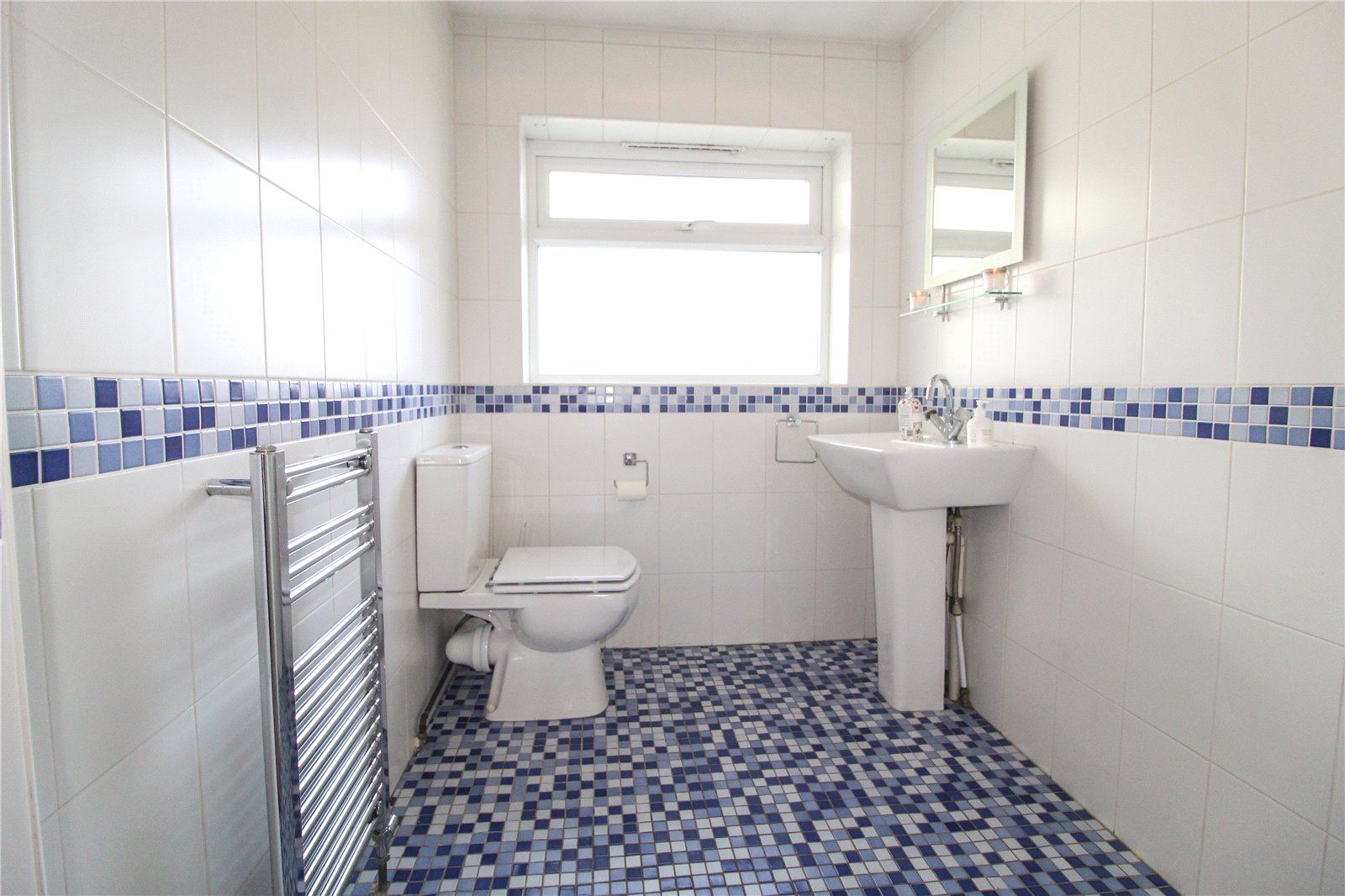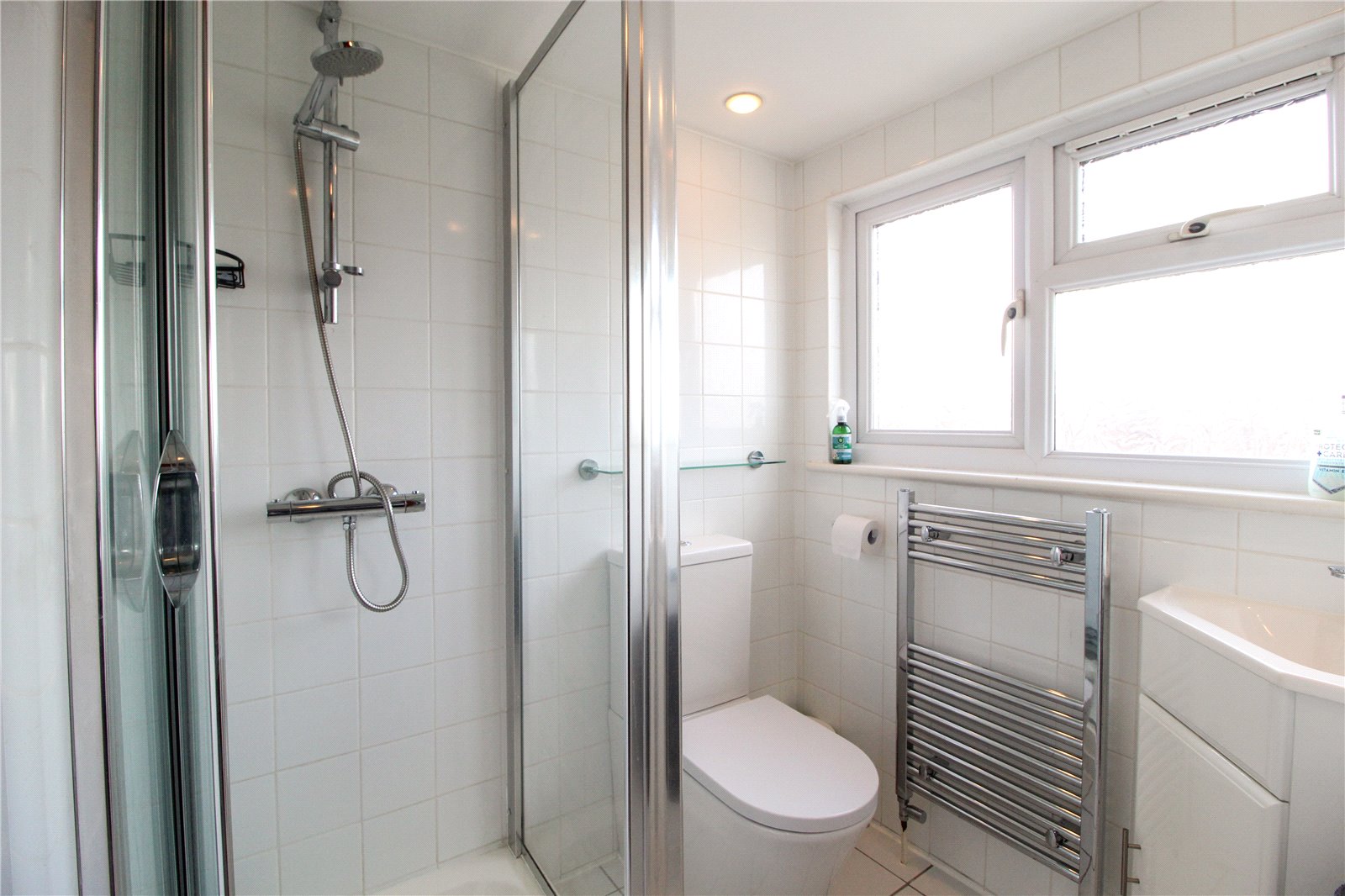 Obscured uPVC double glazed window to front. Fully tiled, low level wc, pedestal wash basin, shower unit, heated towel rail. Lighting.