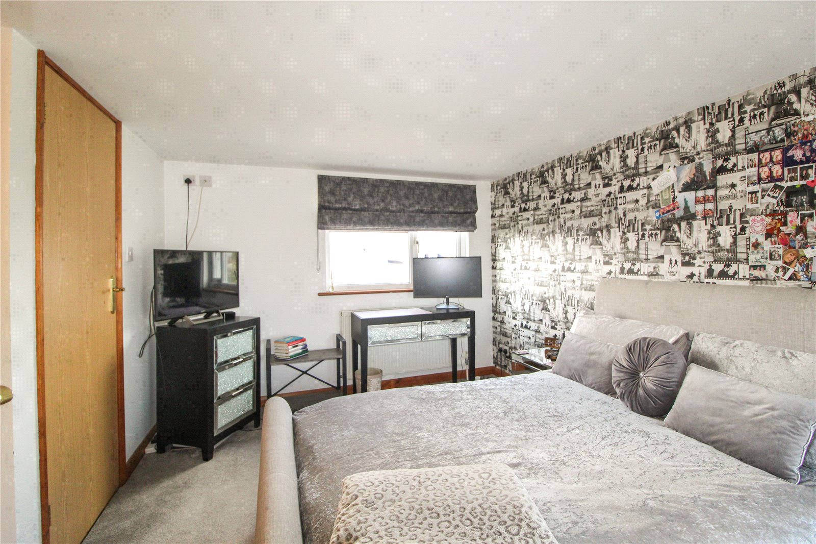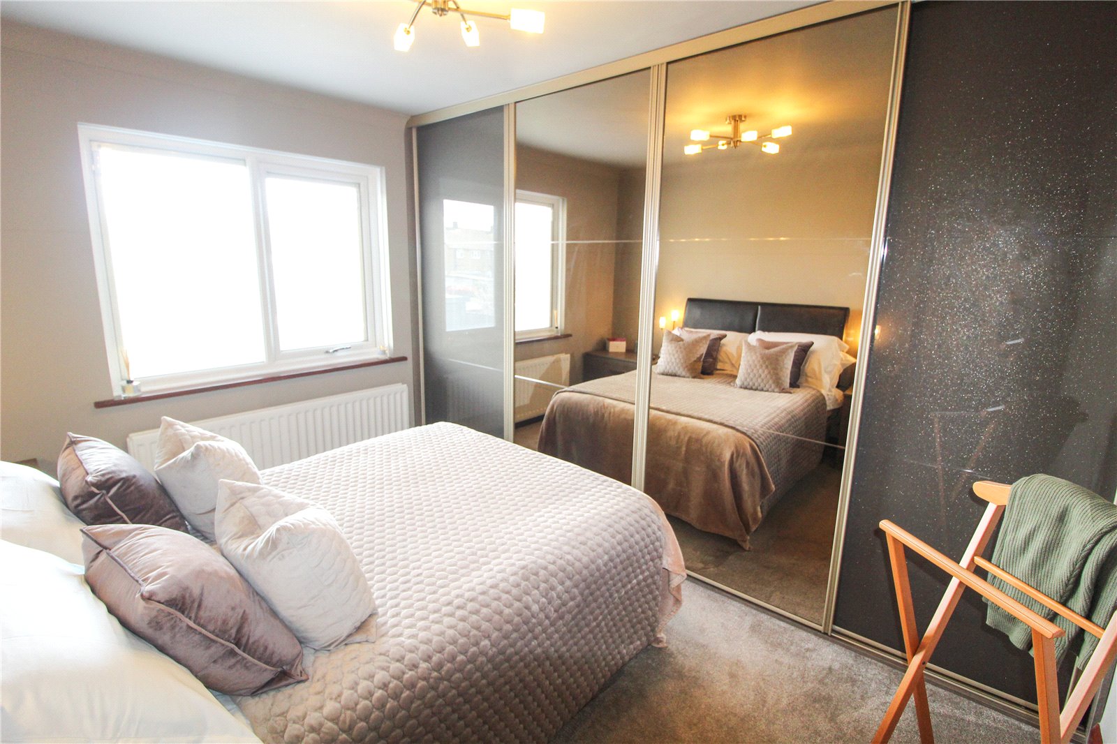 uPVC double glazed window to rear fitted with integral blinds. Carpet to floor. Skirting. Full width set of double sliding doors giving access to built-in wardrobes housing wall-mounted television and storage space. Double banked radiator. Ceiling light.