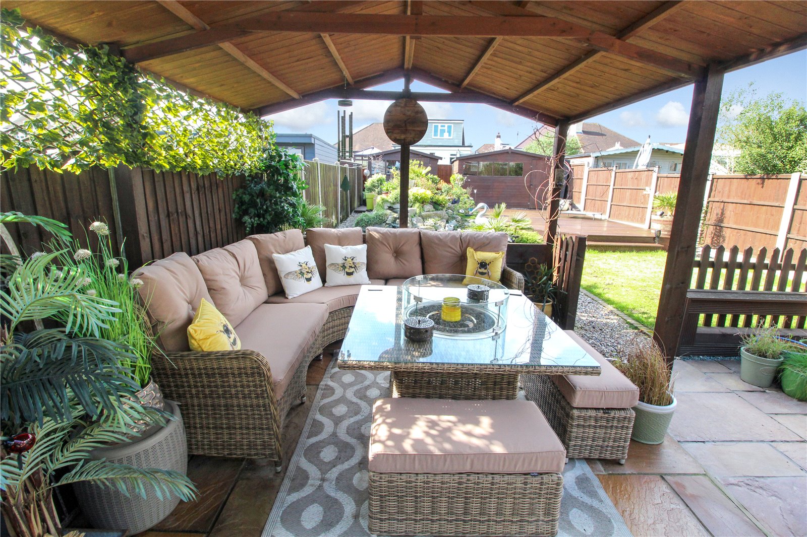 A patio commences from the kitchen/dining room and utility room towards two separate seating areas, one of which is underneath a covered pergola.