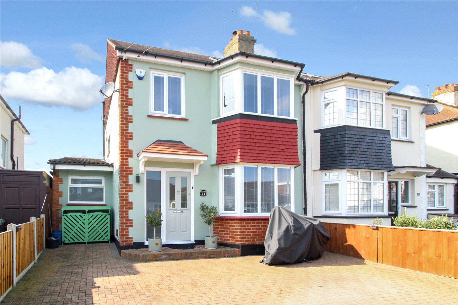 The front of the property provides off-street parking for several vehicles by way of a block-paved driveway and retains a bin store as well as electrical sockets.