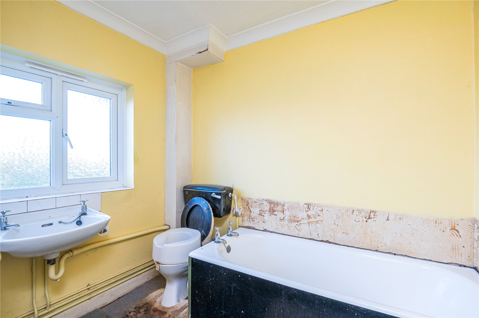 Obscure uPVC double glazed window to rear. Access to airing cupboard housing foam lagged copper cylinder with immersion. Fitted with a three piece comprising panel enclosed bath, low level WC and suspended wash handbasin. Coved cornice to ceiling. Drop light switch.