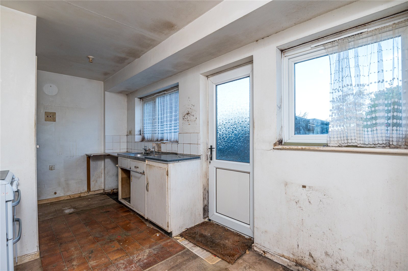 Two uPVC double glazed windows to rear. Obscure uPVC double glazed door to rear. The kitchen has a double base unit with sink, and storage cupboard adjacent. Access to shelved larder cupboard. Tiled splashback. Smooth plastered ceiling.