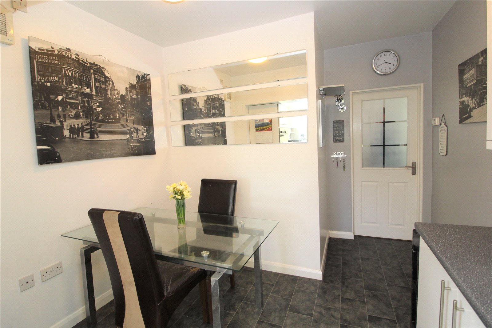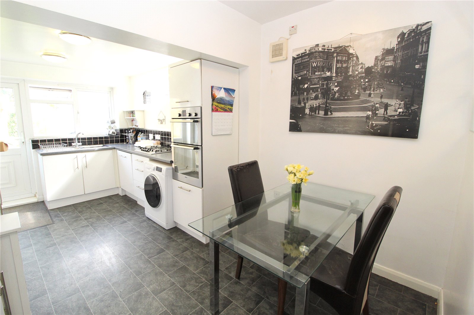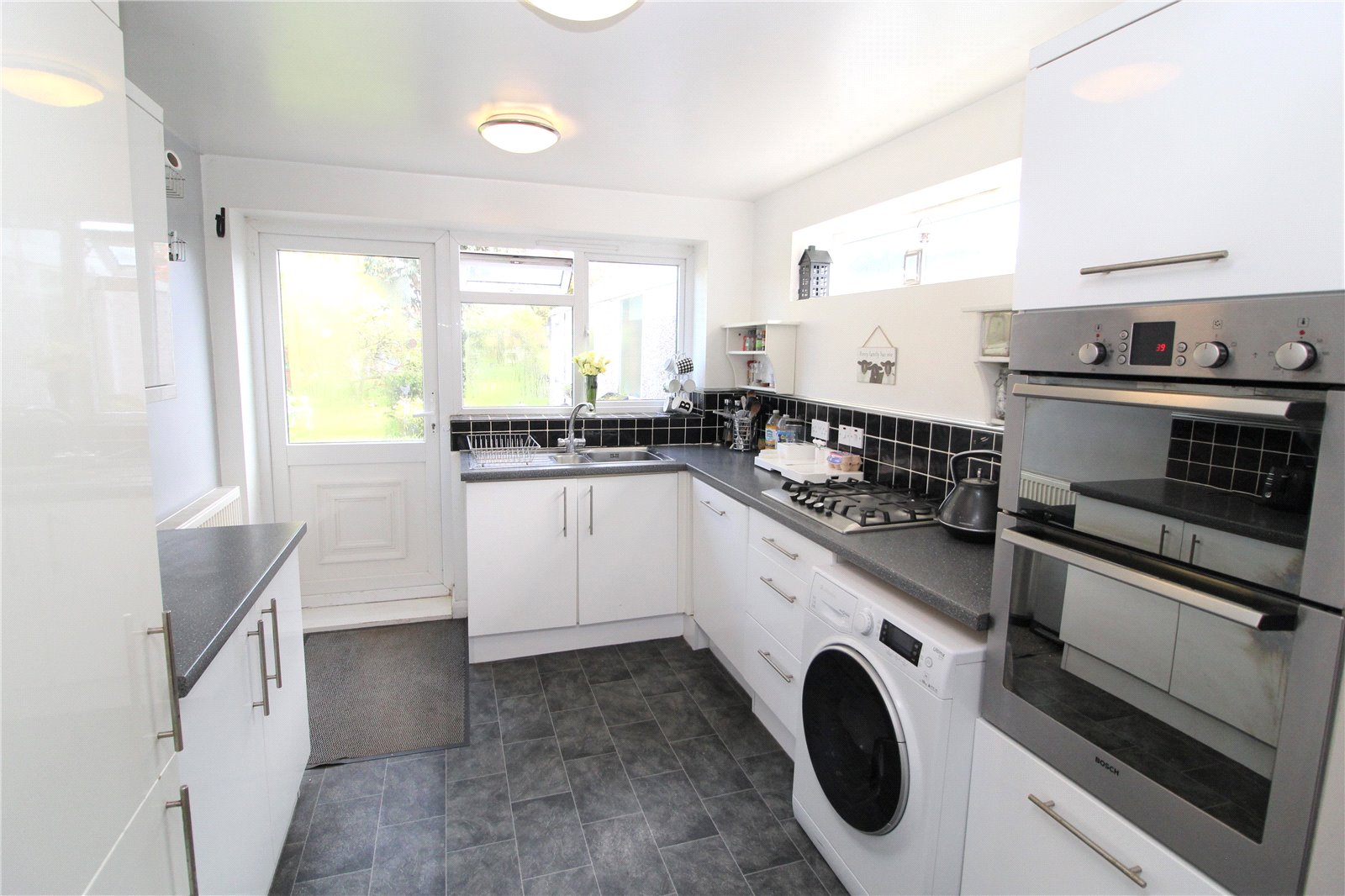 Fitted with a range of modern white units comprising stainless steel sink unit with mixer tap. Roll edge work surface with a range of base cupboards and drawers under, matching eye level cabinets above. Built-in four ring gas hob with built-in eye level double oven adjacent. Integrated dishwasher and fridge/freezer. Space and plumbing for washing machine. Double glazed windows to side and rear. Double glazed door giving access to rear garden.
