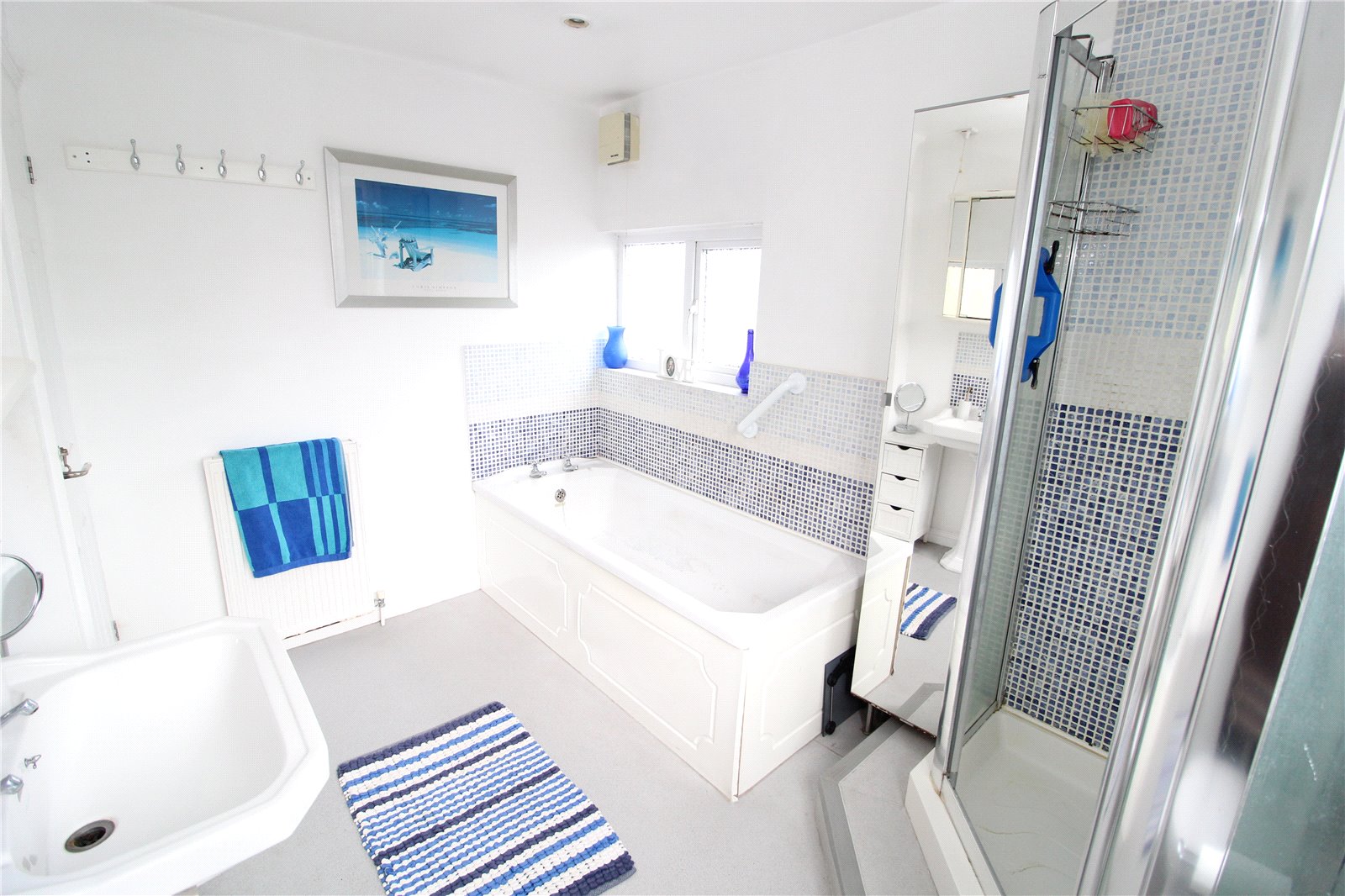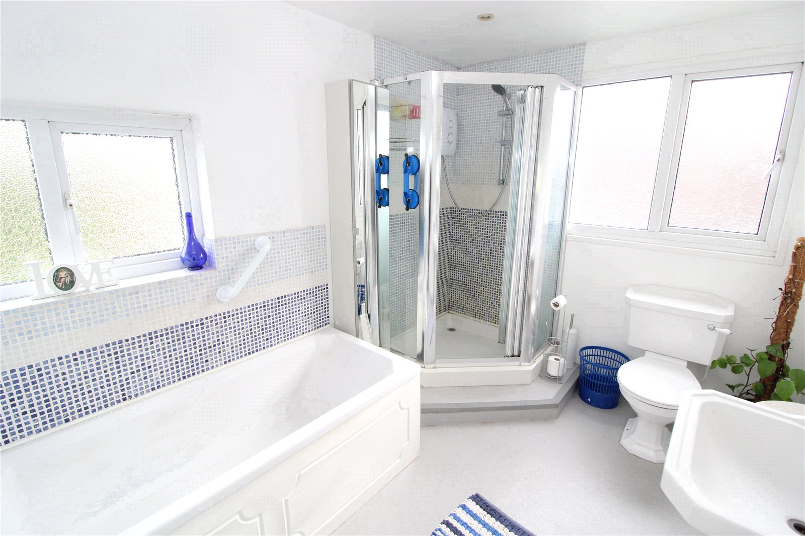 Fitted with a white four piece suite comprising panelled bath, fully tiled corner shower cubicle, pedestal wash hand basin and low flush w.c., Smooth plastered walls and ceiling with inset spotlights. Extractor fan. Radiator. Double glazed obscure windows to side and rear.
