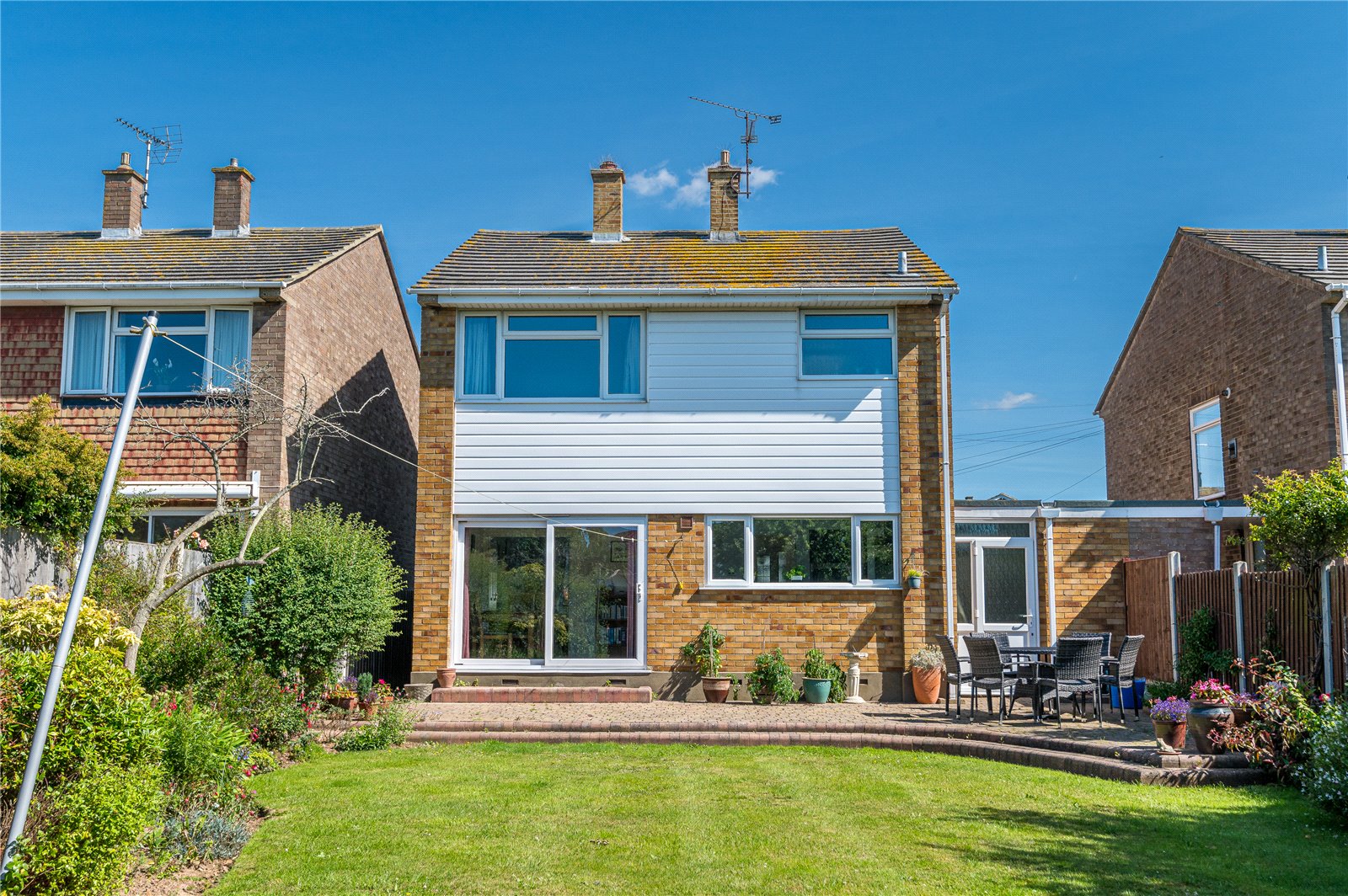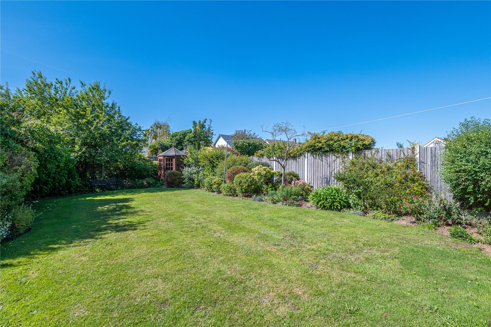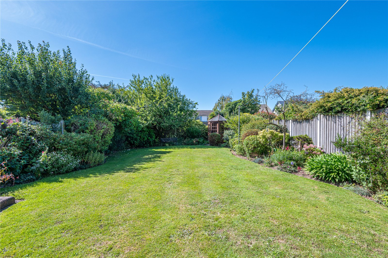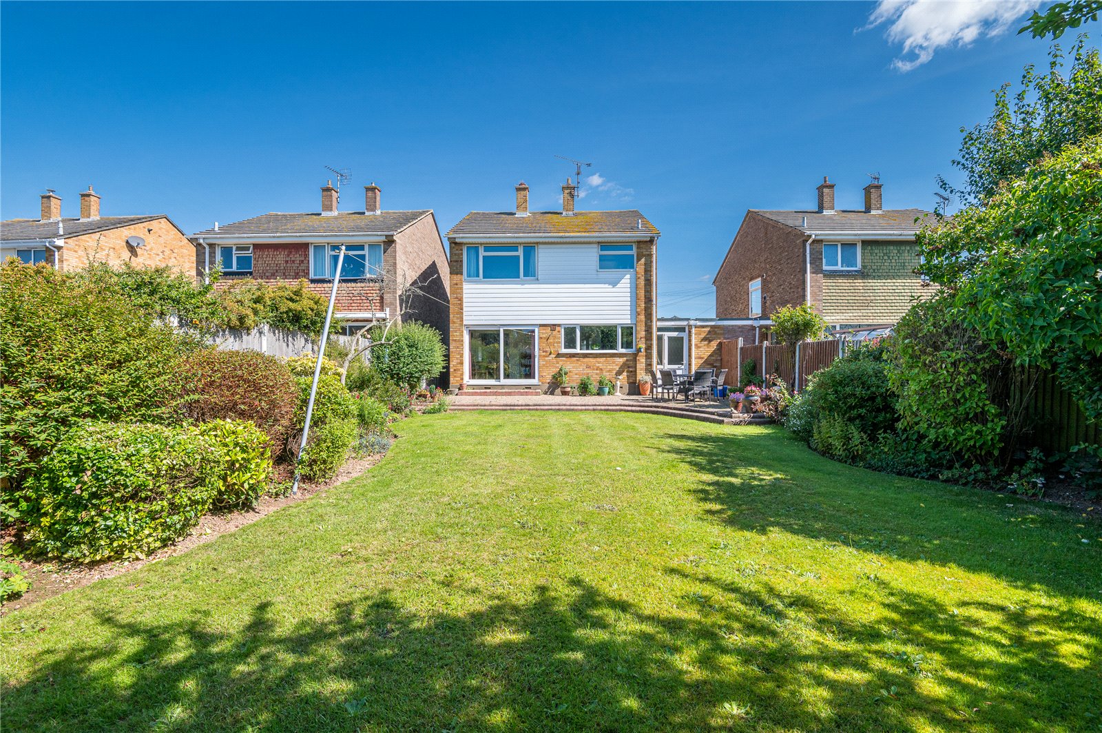 The property benefits from a beautifully established South backing rear garden which is mostly laid to lawn with mature planted borders offering a wide range of trees and shrubs. Large block paved patio area with planted borders. Access to side.
