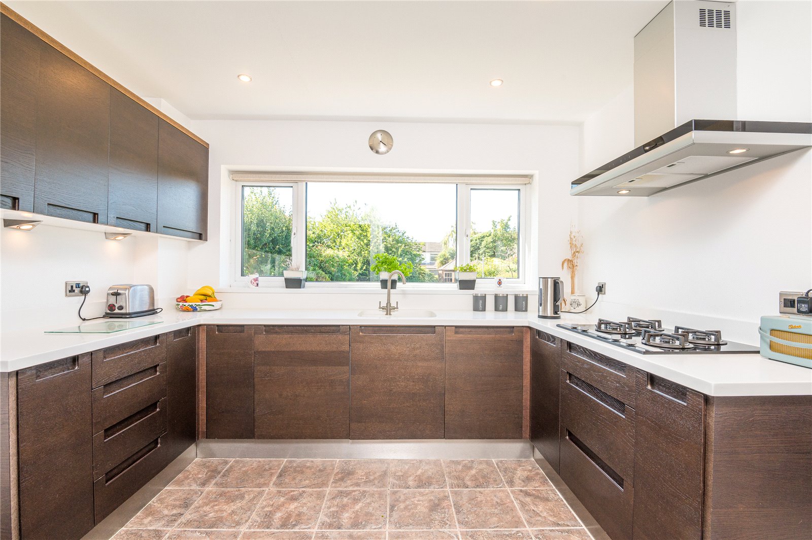 UPVC double obscured glazed doors to front and rear with double obscured glazed windows adjacent. Fitted with a modern and contemporary range of base and eye level wooden units with recessed handles. Rolled edge working surface. Integrated AEG washing machine. Fully tiled floors. High level skirting.