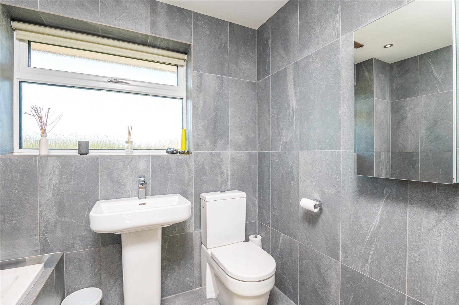 UPVC double obscured glazed window to rear. Bathroom is fitted with a modern and contemporary three piece suite with low flush WC, pedestal wash hand basin with mixer tap and panelled bath with wall mounted mixer plus adjustable overhead shower attachment and glass shower screen. Electric chrome heated towel rail. Large fitted vanity mirror with storage behind. Fully tiled floors. Fully tiled walls. Smooth plastered ceiling with recessed LED lighting. Ceiling mounted warm air central heating vent.