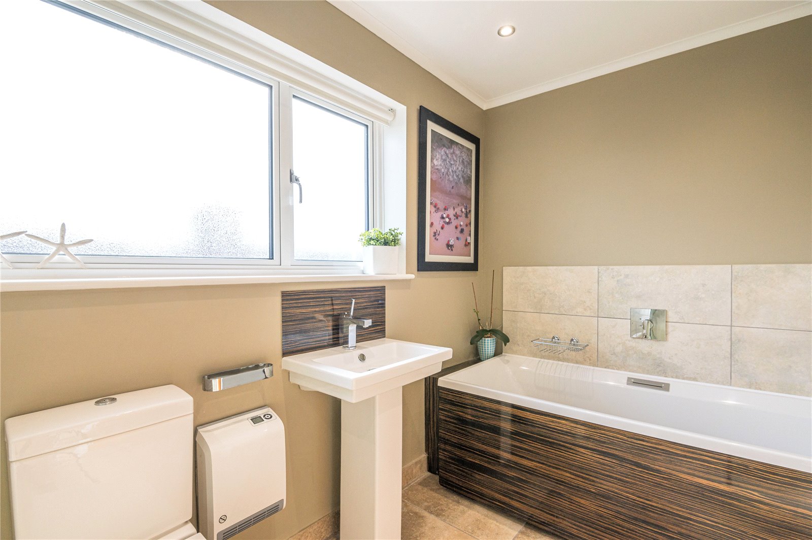 Spacious bathroom fitted with a modern luxury white suite comprising, double ended bath. Separate fully tiled double shower cubicle. Pedestal wash basin with mixer tap. Low flush W.C. Tiled floor. Designer radiator. Coved ceiling with recessed lighting. Double glazed window to side.