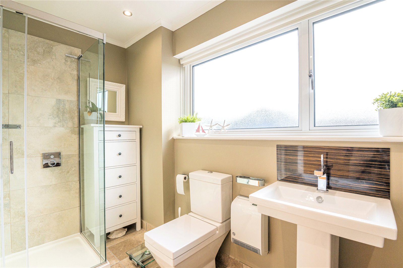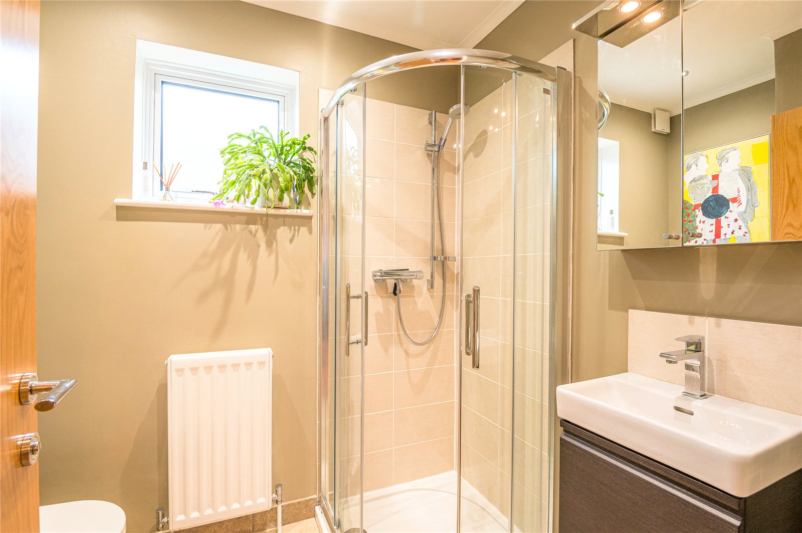 Fitted with a modern luxury white suite comprising quadrant corner shower cubicle. Vanity unit with wash basin, mixer tap and cupboard below. Low flush W.C. Built in cloaks cupboard. Radiator. Tiled floor. Coved ceiling with recessed lighting. Double glazed window to side.