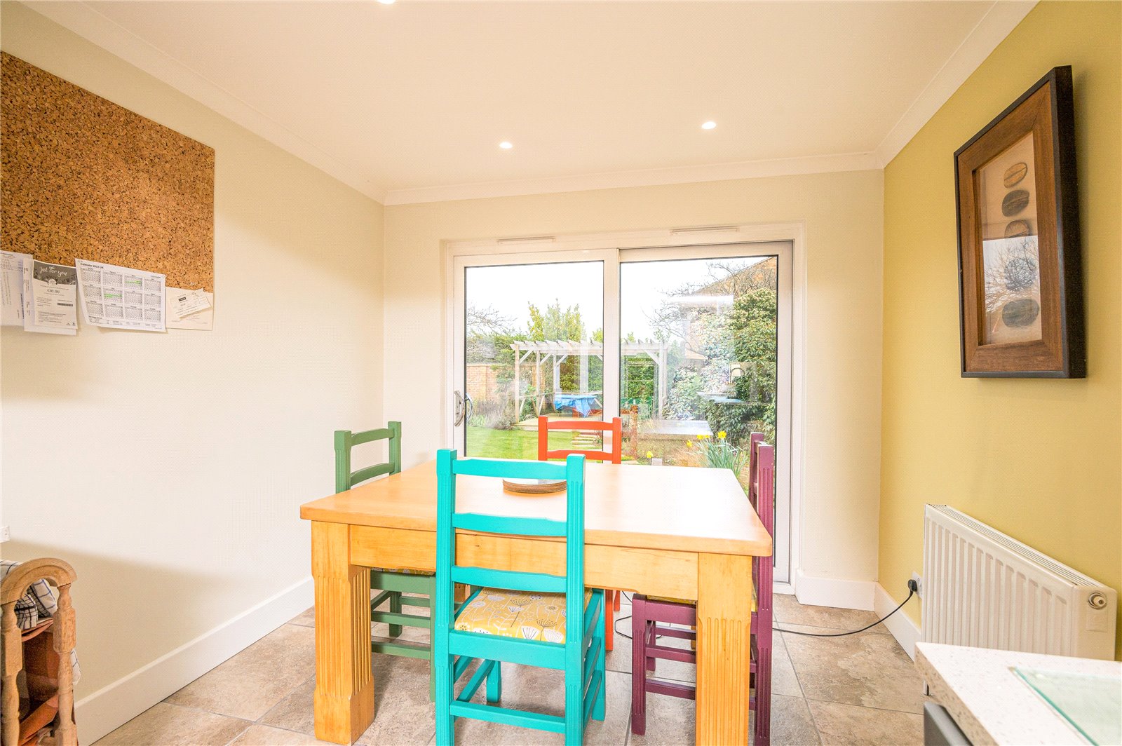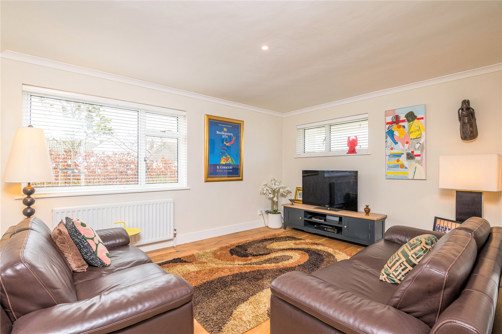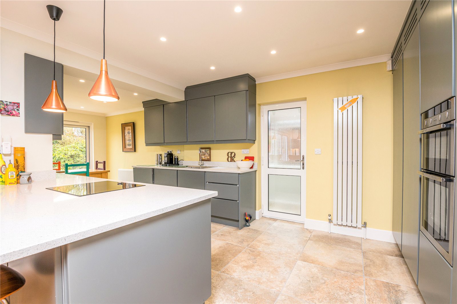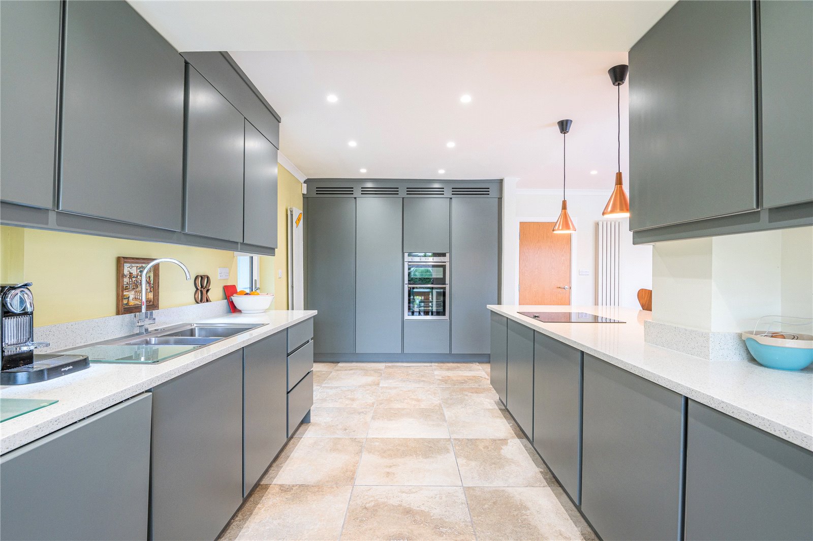 Overall size. This fabulous open plan “L” shape living space is the real hub of the house and enjoys a dual aspect with a double glazed window side and wide double glazed bi-fold doors, with integrated blinds, framing lovely views across the rear garden. Further double glazed sliding patio doors leading to the rear garden. Solid oak wood flooring. Two radiators, plus two designer radiators. Coved ceiling with recessed lighting. The kitchen is fitted with a modern luxury range of contemporary grey fronted units and quartz work surfaces. Inset stainless steel sink with mixer tap. Range of cupboards and drawers below. Built in dishwasher with matching decor panel. Further work surface/breakfast bar with inset “Neff” induction hob. Range of cupboards below. Range of full height matching cupboards with built in full height fridge and full height freezer with matching decor panels. Oven housing between with built in “Neff” double oven with cupboards above and below. Matching storage cupboard housing combination gas fired central heating boiler. Range of wall mounted storage cabinets. Tiled floor. Space for sofas and space for dining table. Double glazed door to: