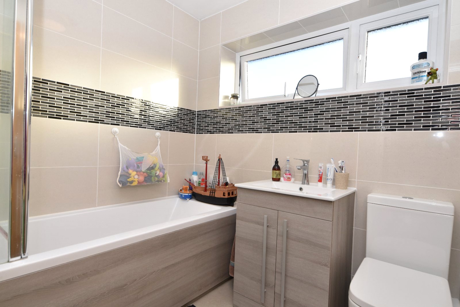 High level obscure uPVC double glazed window to rear aspect. The modern suite three piece suite comprises panelled enclosed bath with mixer taps and integrated shower unit over with fitted shower screen, vanity wash hand basin with mixer tap over and storage cupboards under and a dual flush WC. Partly tiled walls with attractive border tile. Tiled flooring. Radiator. Smooth plastered ceiling.