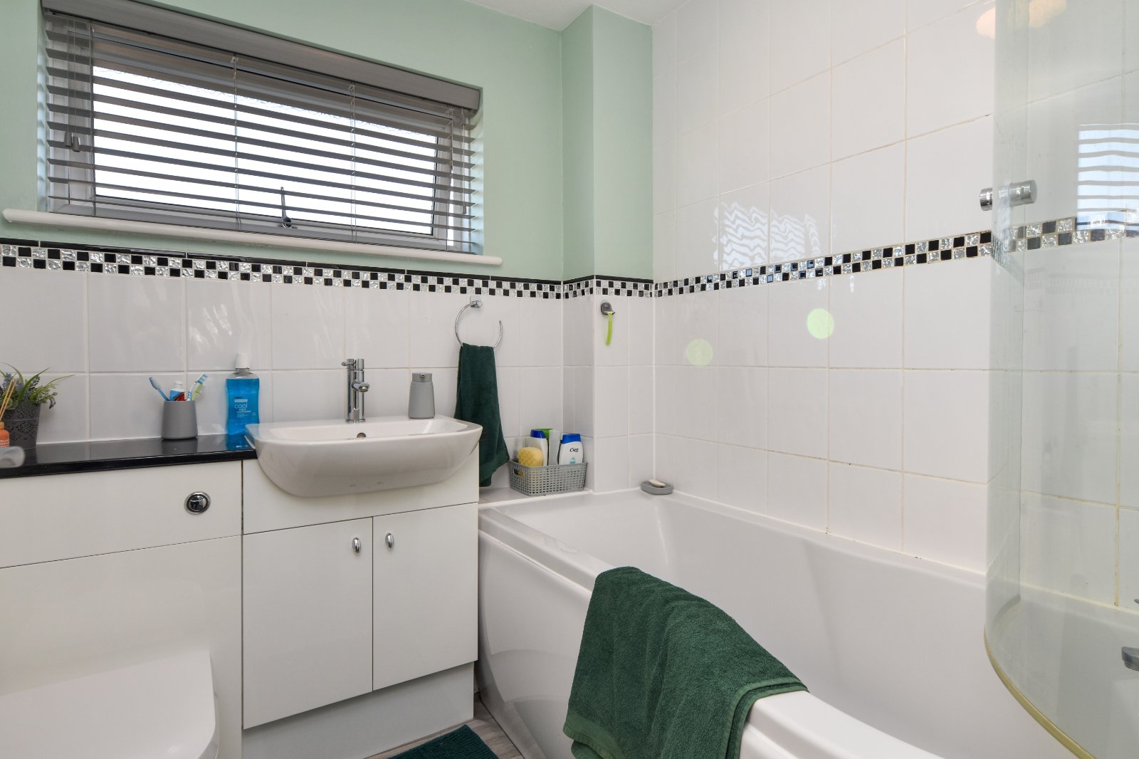High level obscure uPVC double glazed window to rear aspect. The modern three piece suite comprising ‘P’ shaped shower bath with curved shower screen, mixer tap and wall mounted 'Triton' electric shower over, wash hand basin set into vanity unit with mixer tap over and concealed cistern dual flush w/c. Partially tiled walls inset with mosaic border tile. Radiator. Laminate wood effect flooring. Textured ceiling.