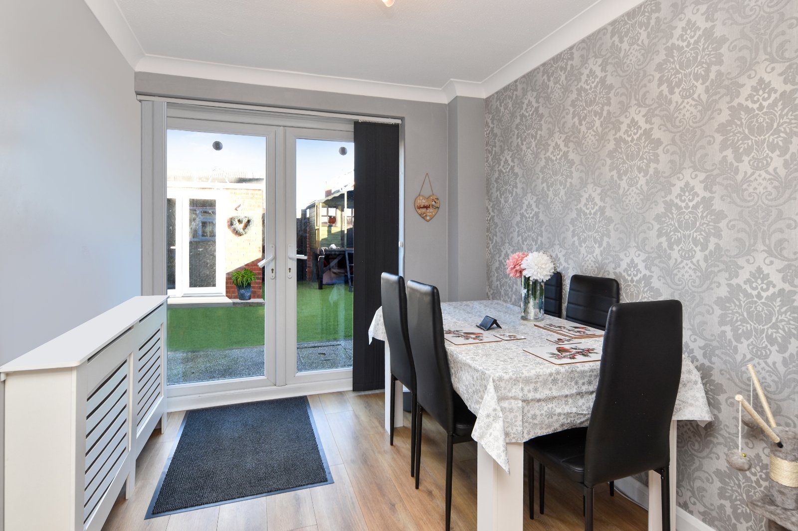 Pair of uPVC double glazed French doors to rear leading to rear garden. Door to under stairs storage cupboard. Radiator. Laminate wood effect flooring. Semi open plan to Kitchen area. Feature wallpapered wall. Coving to textured ceiling.