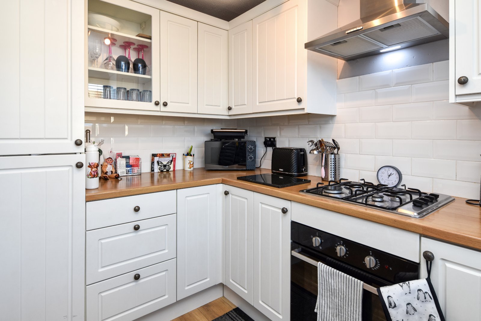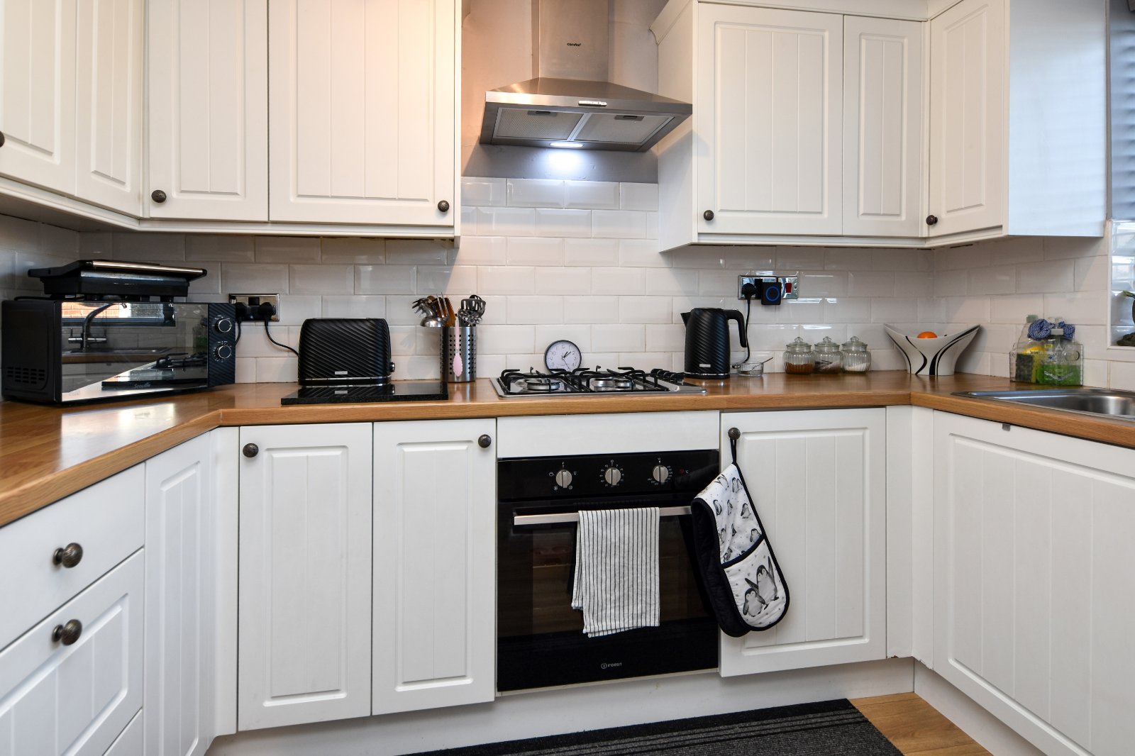 uPVC double glazed window to rear aspect. The Kitchen is fitted with a range of eye and base level units with roll top work surfaces incorporating one and a half stainless steel sink and drainer unit with mixer tap. Integrated ‘Indesit’ electric oven with four-ring gas hob and wall mounted extractor unit above. Space for fridge/freezer behind tall larder style cabinet doors. Under counter recess for washing machine. Partially tiled walls with gloss metro-style tiling. Laminate wood effect flooring. Textured ceiling.