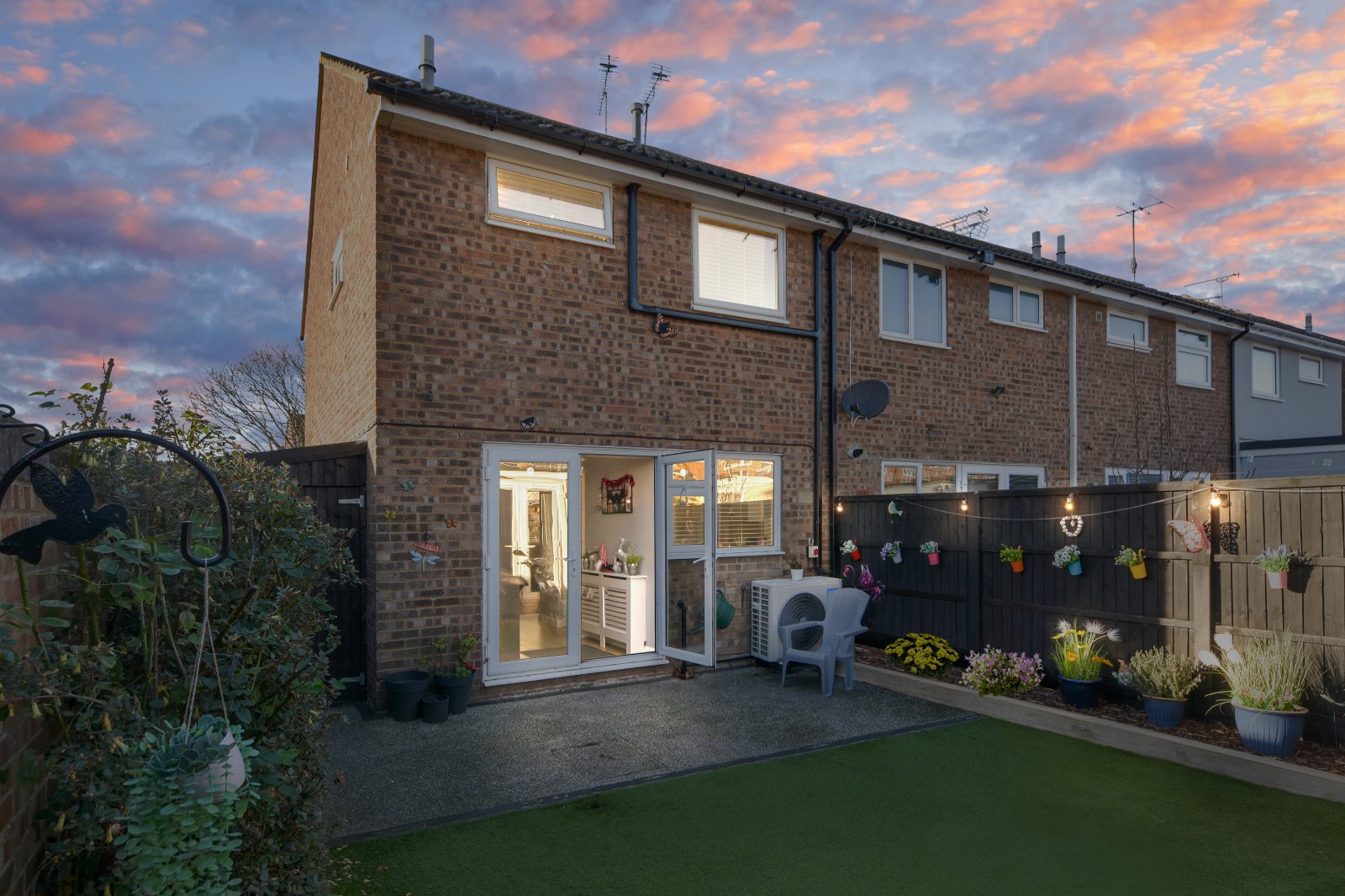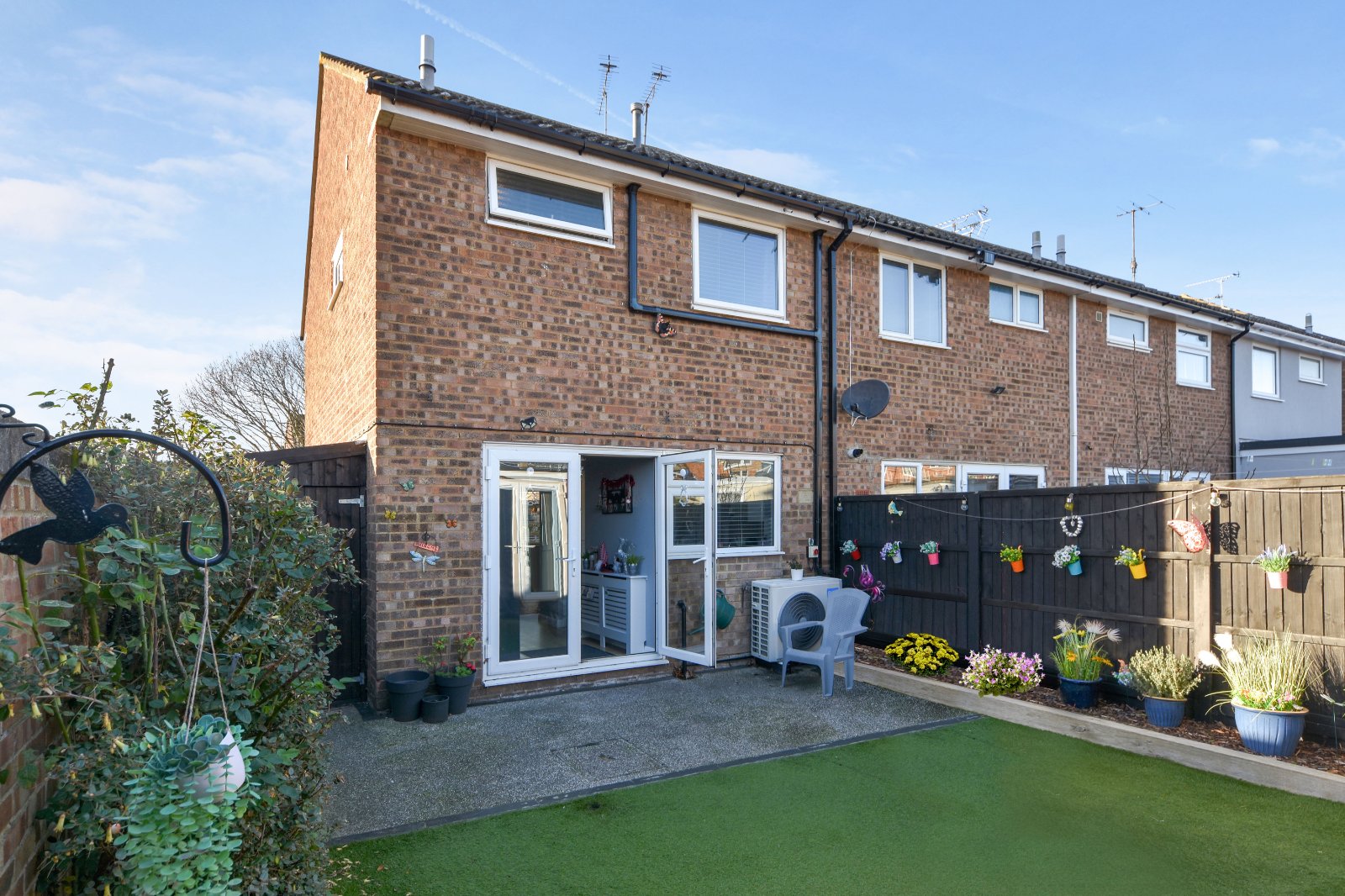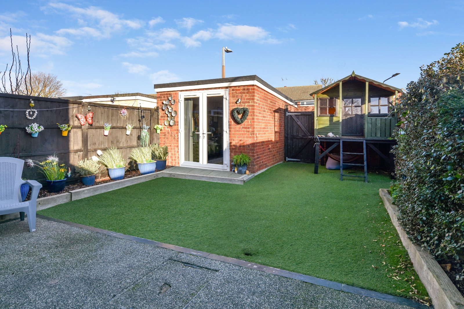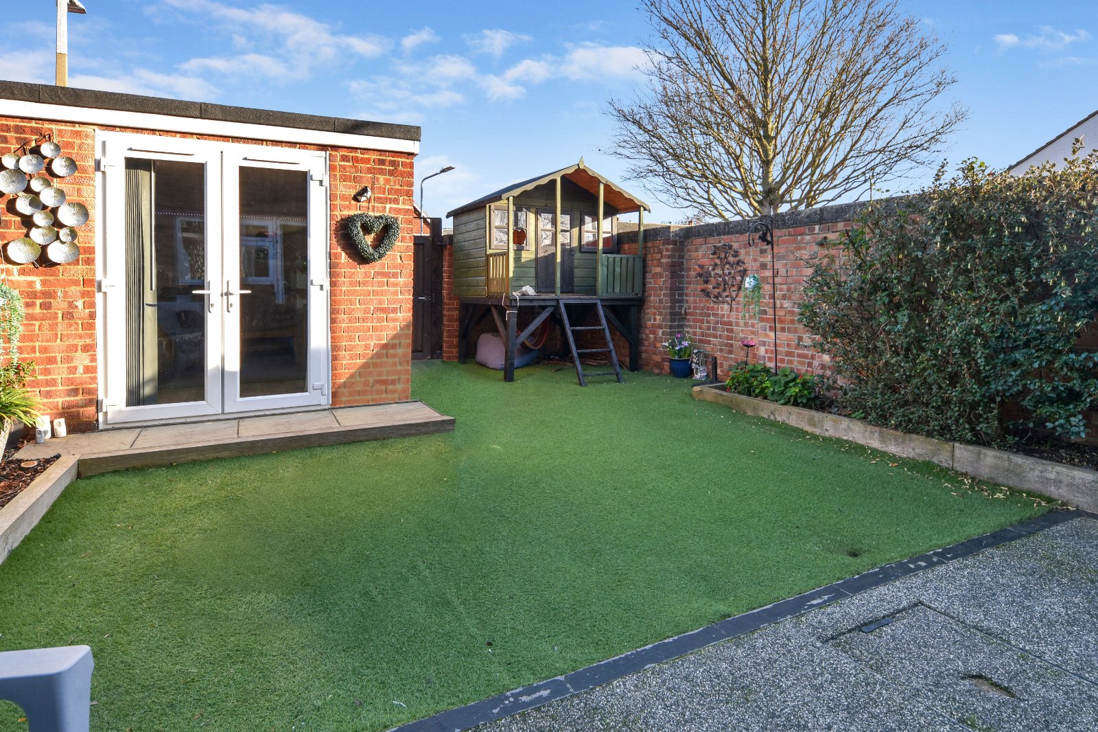 The garden is approached via the Dining area and commences with a resin patio seating area leading to artificial lawn. Outside water tap. Timber shed to side of property. Gated rear access to parking. Access to brick-built former garage/studio. Raised timber playhouse set on stilts with steps and enclosed play area beneath, to remain. Brick wall boundary to side aspect with the remainder fenced.