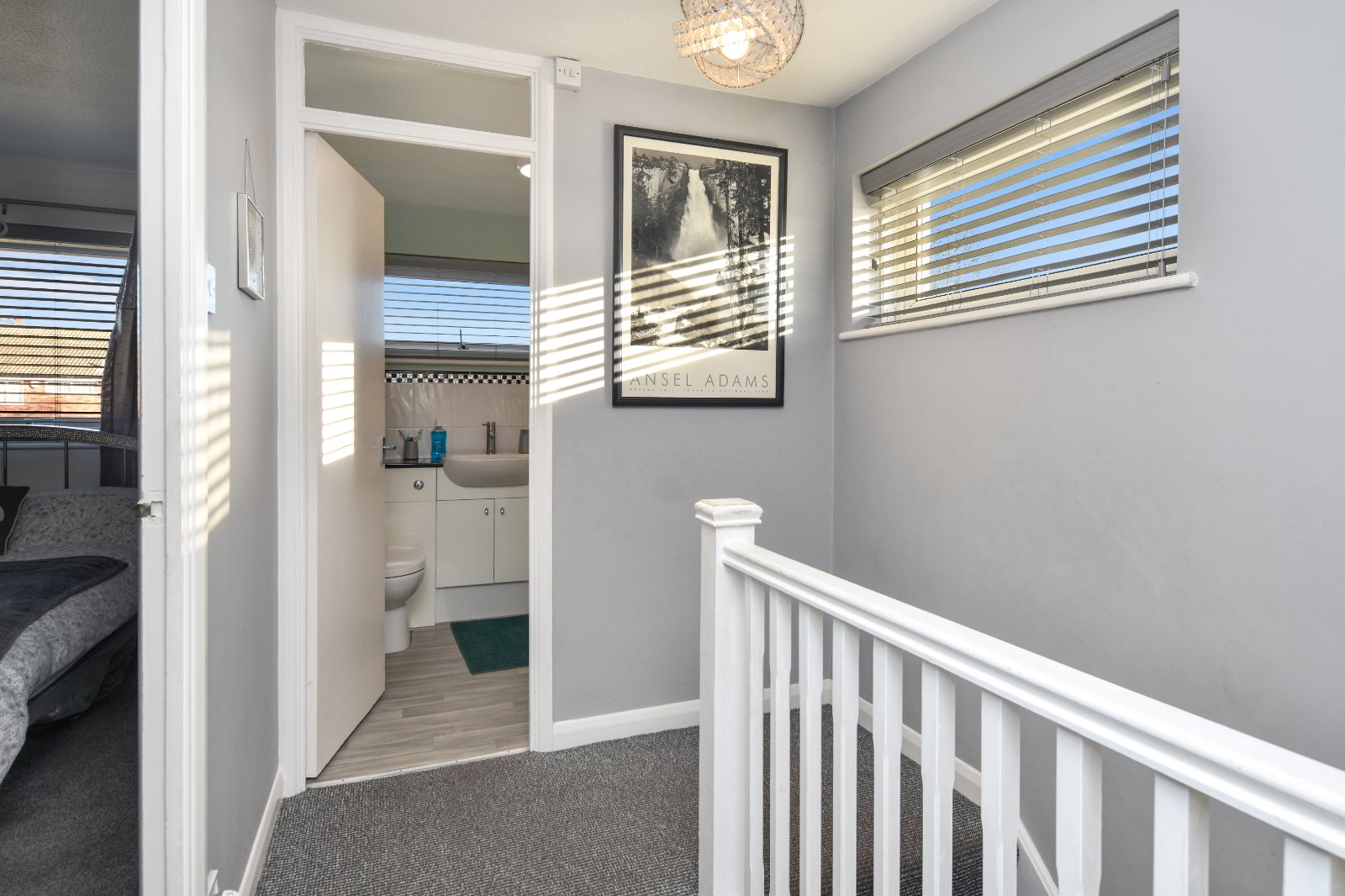 High level uPVC double glazed window to side aspect. Spindle balustrade. Textured ceiling with loft access.