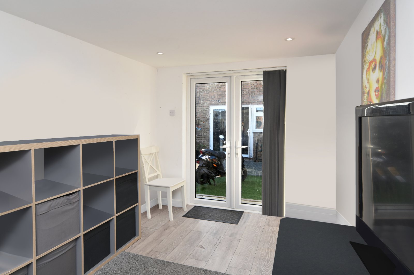 Insulated room with smooth plastered ceiling inset with recessed ceiling spotlights. uPVC double glazed French doors to rear garden.