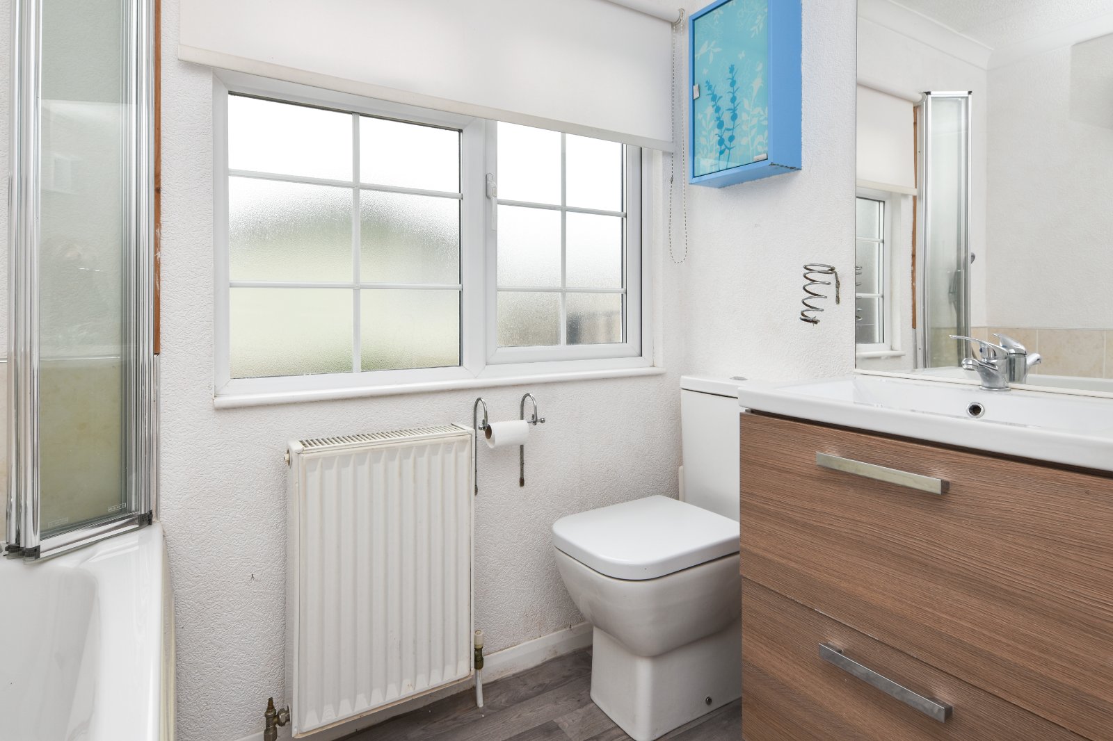 Obscure Georgian style double glazed window to front aspect. The three piece suite comprises panelled enclosed bath with twin hand grips, mixer tap with hand held shower attachment, dual flush WC and vanity wash hand basin with storage drawers under. Radiator. Wall mounted extractor fan. Partly tiled walls. Shaver point. Coving to textured ceiling.