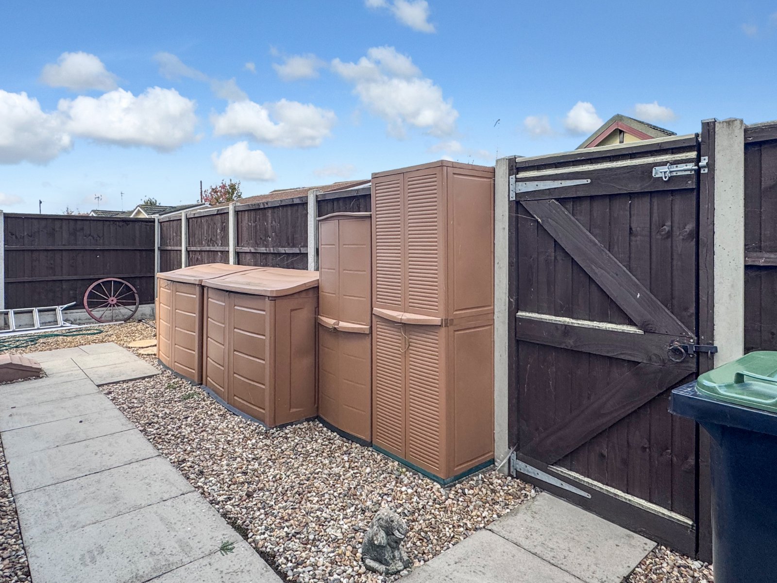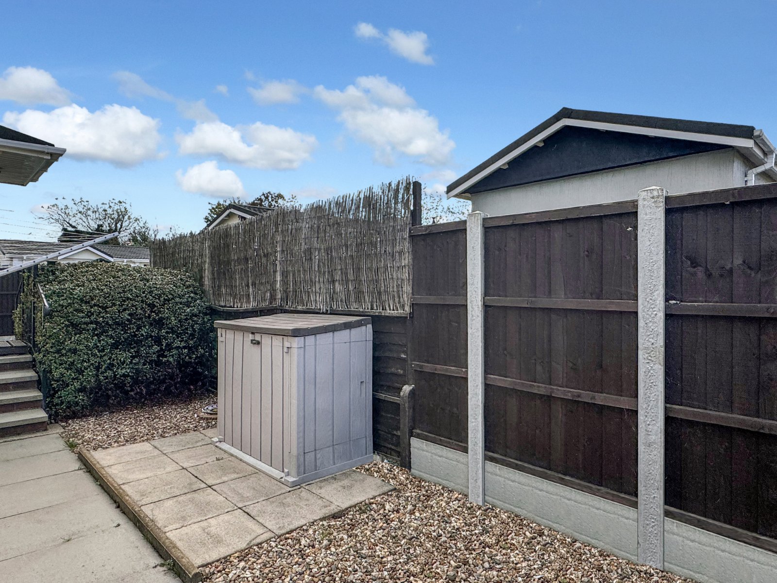 The wrap-around garden is accessed via the Living Room/Diner, with steps leading down to a paved pathway surrounding the property. Designed for ease of maintenance, it features low-maintenance shingled areas, a metal storage shed (to remain), and a further shingled seating area — ideal for relaxing outdoors. Gated access leads to the front of the property and the private parking space. (Please note: one of the metal-framed sheds will be removed prior to completion as it is damaged.)
