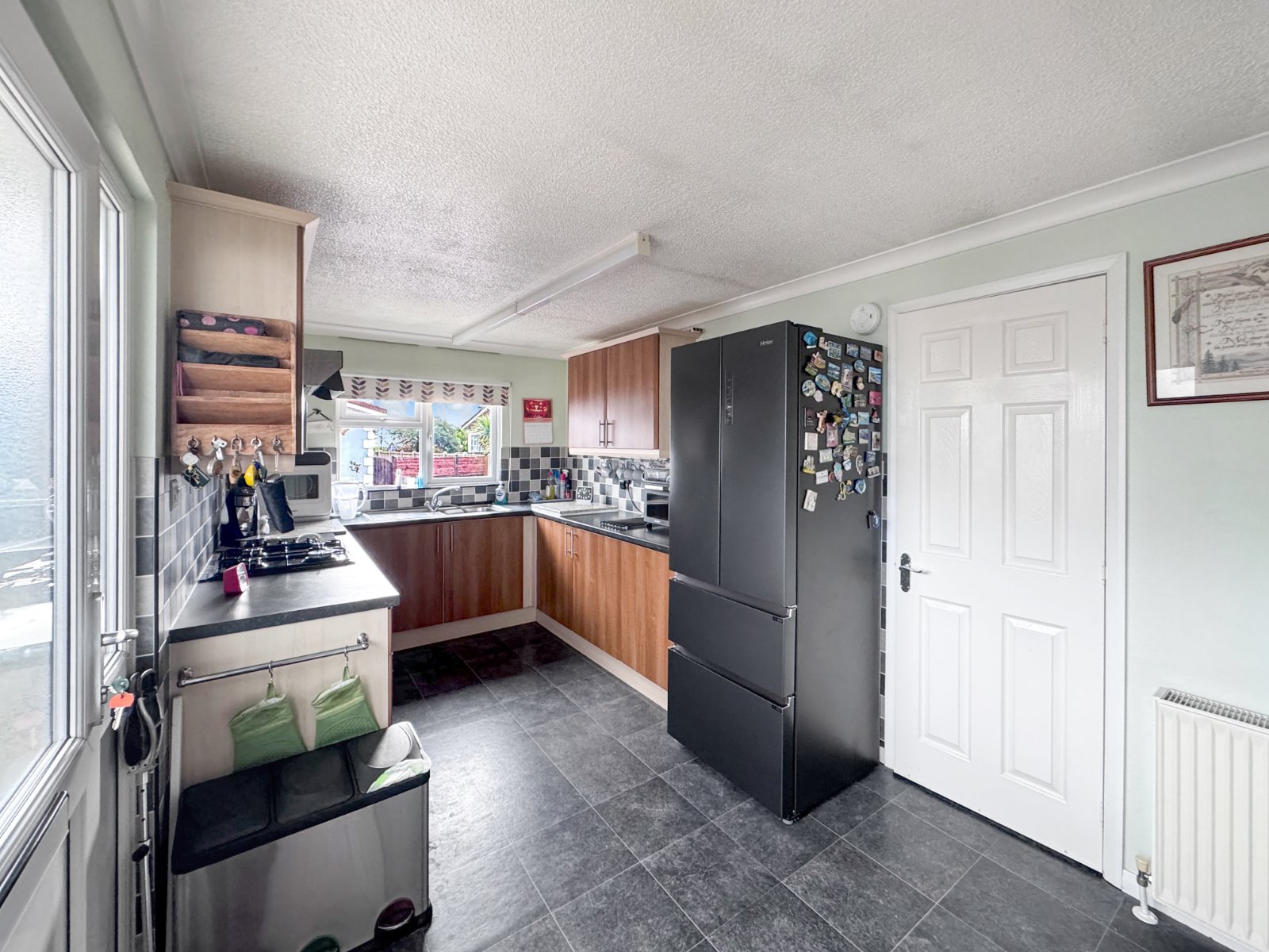 uPVC double glazed window to front aspect with distance sea glimpses. Panelled door to built in cupboard housing. The Kitchen is fitted with an attractive range of eye and base level units with wood effect working surfaces over inset with stainless steel single drainer sink unit with mixer tap over. Built in double oven with 'Electrolux' four ring gas hob and extractor canopy over. Freestanding 'Haier' fridge/freezer (to remain). Further under counter recesses for appliances. Radiator. Coving to textured ceiling. Panelled door to;