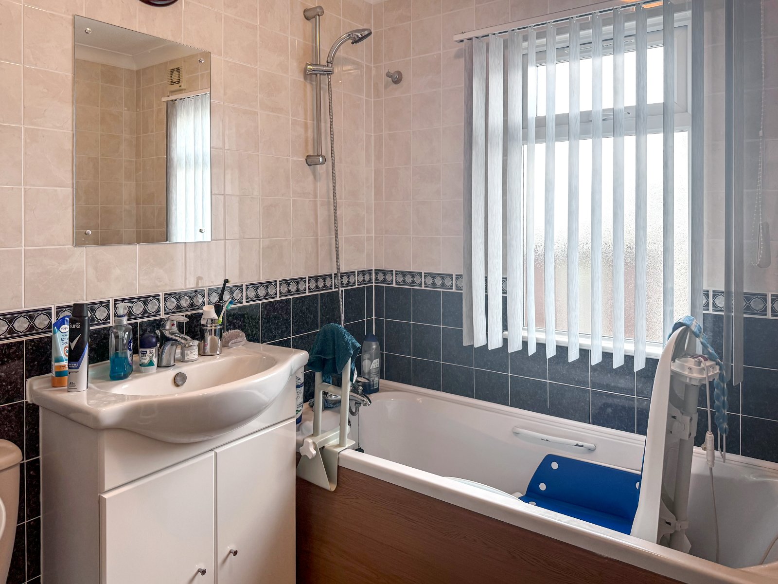 Obscure uPVC double glazed window to side aspect. The three piece suite comprises panelled enclosed bath with twin hand grips, mixer tap with hand held shower attachment, dual flush WC and vanity wash hand basin with storage under. Ladder style heated towel rail. Tiling to all visible walls. Coving to textured ceiling.