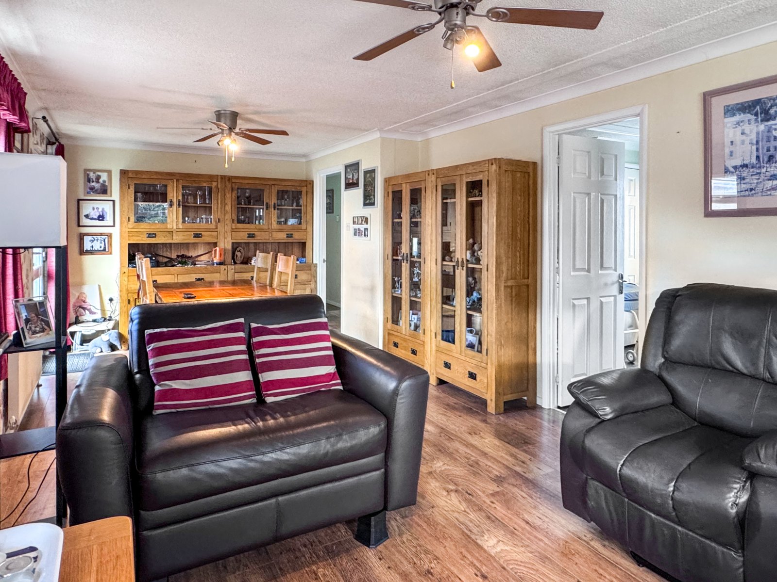 Living Room Area:  Double glazed bow window to front aspect with partial distance sea glimpses. Further uPVC double glazed window to side aspect. Radiators. Laminate wood effect flooring.  Attractive feature fireplace with a cream surround and matching hearth, incorporating an inset gas fire with polished brass trim. Coving to textured ceiling. Open plan to;