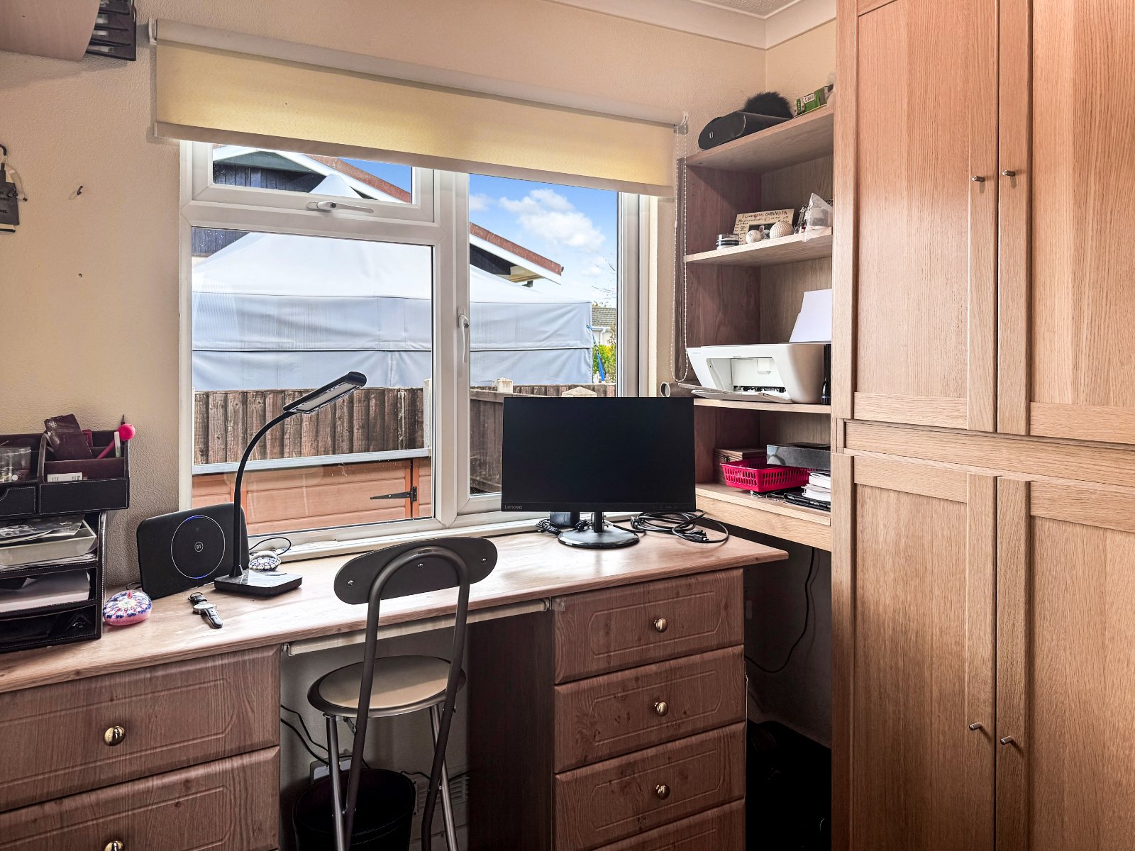 uPVC double glazed window to side aspect. The room is currently arranged as a study and fitted with a desk and range of built-in shelving, cupboards, and drawers providing excellent storage. Laminate wood-effect flooring. Coving to textured ceiling.