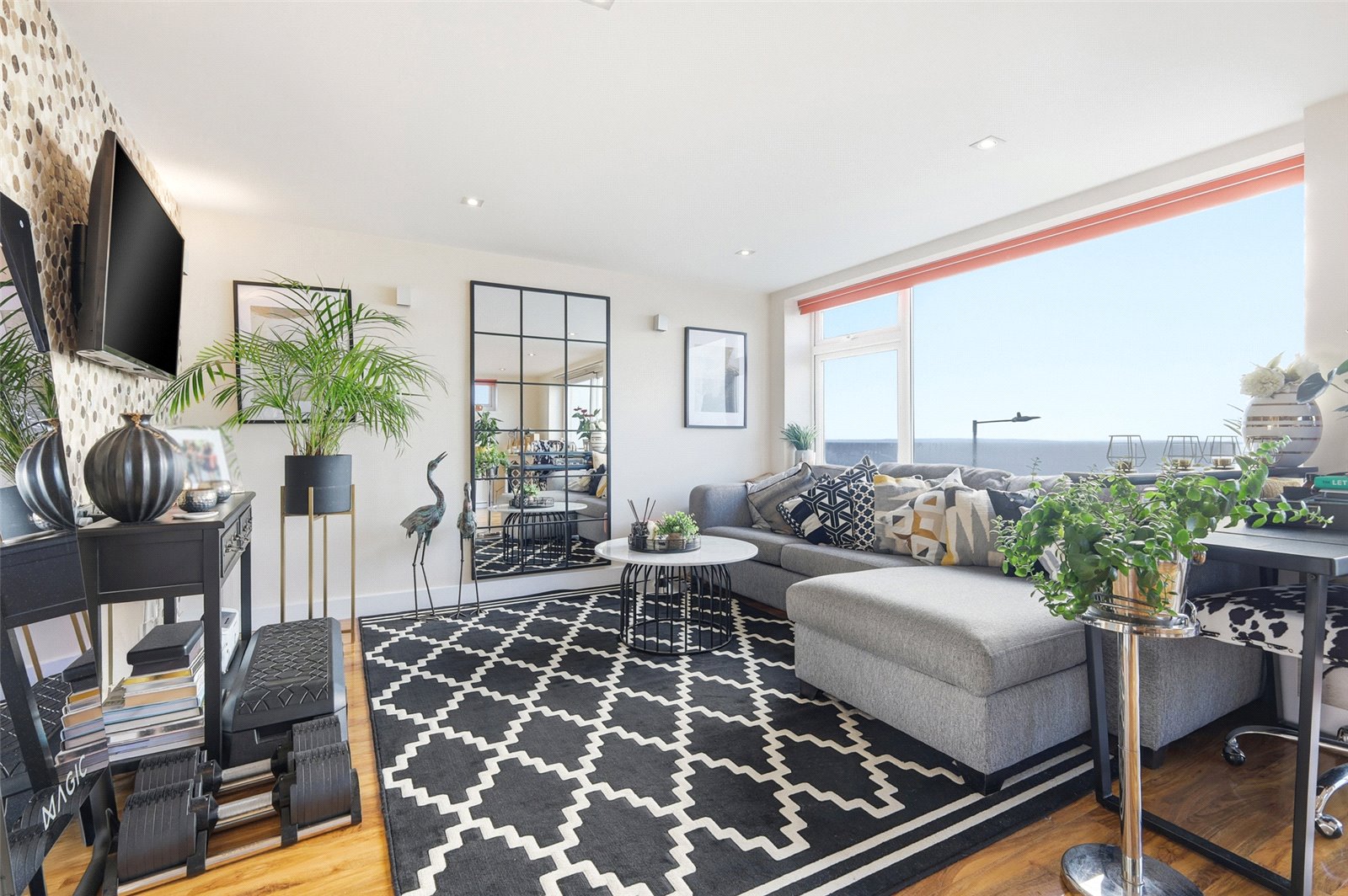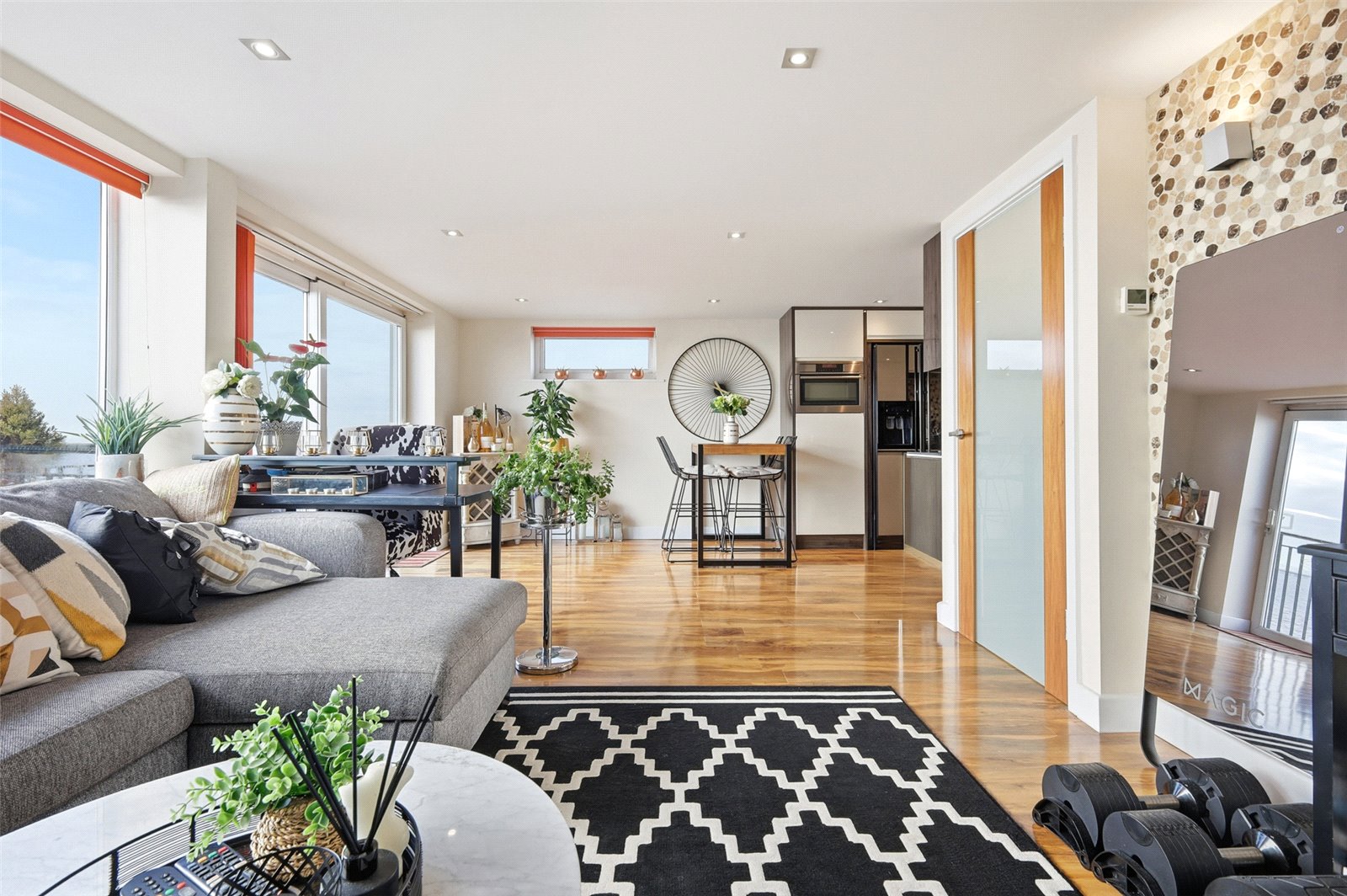 overall size. Large L shape room with UPVC double glazed sliding patio door to front leading to balcony affording wonderful views across seafront and Thames Estuary beyond. Large doble glazed window to front and to side. Modern and contemporary fitted kitchen. High gloss base and eye level cabinets incorporating a rolled edge Corian working surface with integral sink and grooved drainer unit, mixer tap. Inset AEG induction hob with designer extractor hood above. Integrated AEG electric fan assist oven. Space for American style fridge/freezer. Integrated AEG microwave oven. Integrated washing machine. Stone splashback with glass splashback to hob. Wood effect laminate flooring throughout. High level skirting. Coved cornice to smooth plastered ceiling with recessed LED lighting. Feature pebble tiled wall.