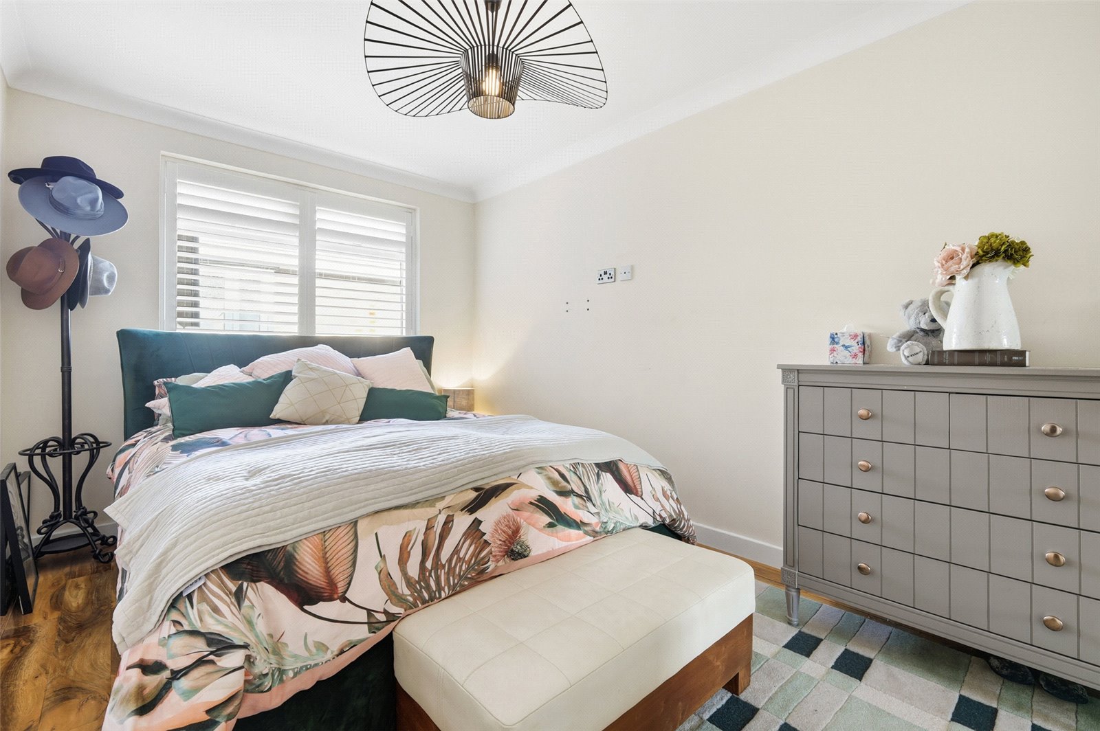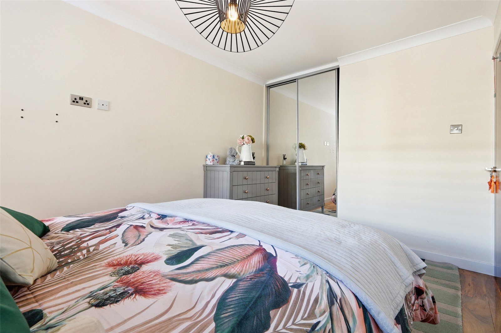 UPVC double glazed window to rear with fitted plantation shutter. Wall mounted radiator. Large walk in wardrobe with mirror fronted doors and ample hanging storage space. Wood effect laminate flooring. High level skirting. Coved cornice to smooth plastered ceiling.