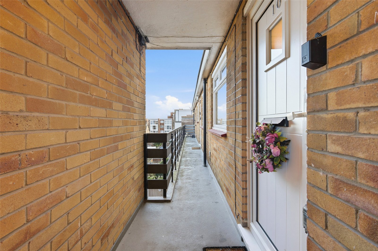 Stairs leading to double security door with entry phone system to side. Stairs rising to second floor accommodation. Door to open passage way. UPVC front door to apartment.
