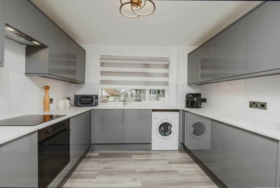 Upvc double glazed window with fanlight above overlooking the side elevation, with fitted roller blind (to remain), smooth plastered ceiling with halogen ceiling light (to remain), extensive range of Howden’s spring close base and wall units in Greenwich High Gloss Slate Grey with Calacatta Mineral high range worktops and backboards, white ceramic sink and drainer with chrome mixer tap, integrated full size Bosch dishwasher (to remain), Indesit washer/dryer (to remain), Lamona ceramic hob with Lamona electric under oven, extractor fan with lighting above, free standing full height Fridgemaster fridge and free standing full height Fridgemaster freezer (both to remain), extensive range of power points, LVT flooring, built in larder cupboard with shelving housing Glow-worm boiler, cupboard above.