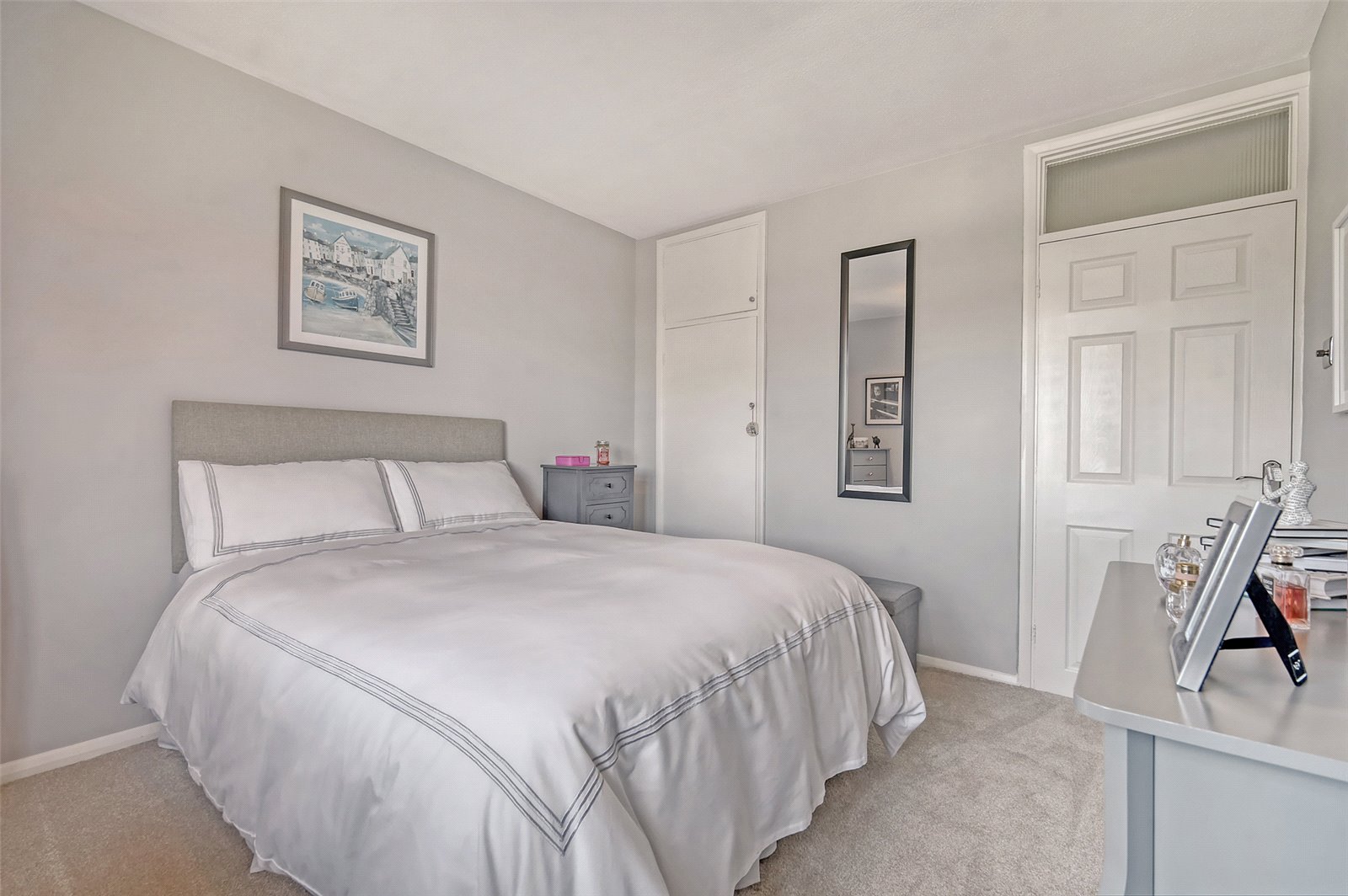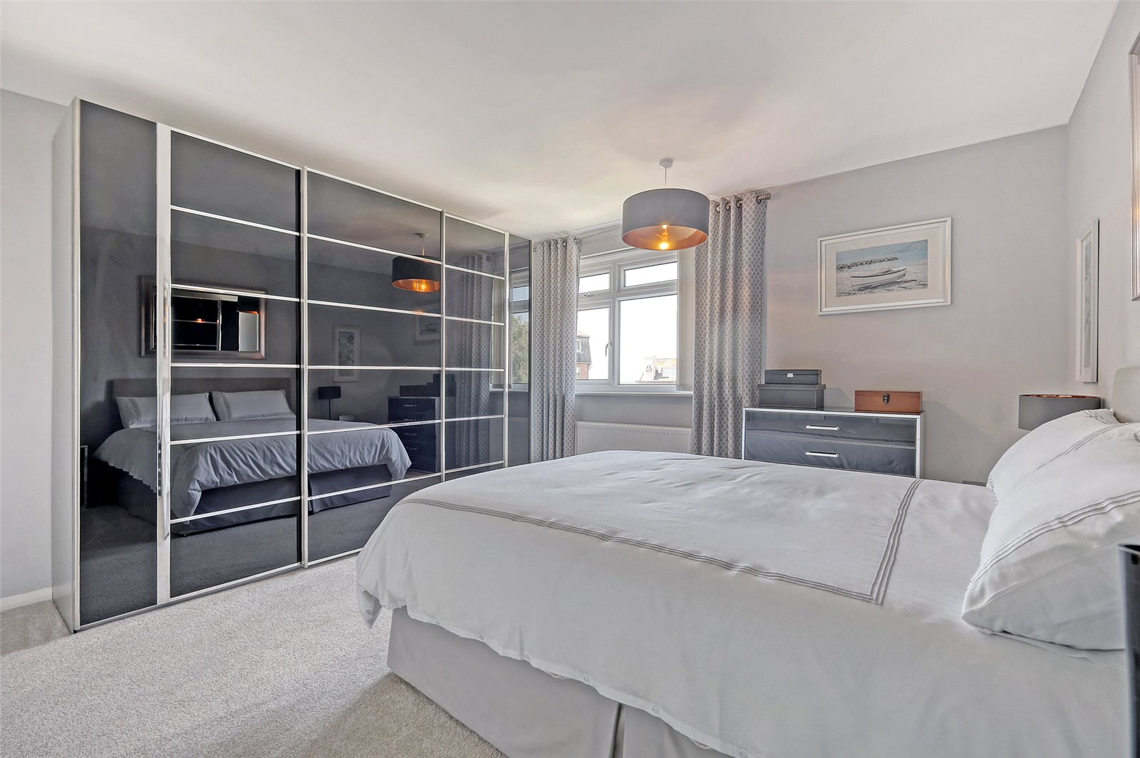 Upvc double glazed window to side elevation with fanlights above, blind and curtains (both to remain), smooth plastered ceiling with ceiling light, large built in double storage cupboard with cupboards above, large range of sliding door fitted wardrobes to remain, matching bedside cabinets and chest of drawers (to remain), radiator, power points, views over beautifully landscaped rear gardens and estuary views towards the pier and beyond.