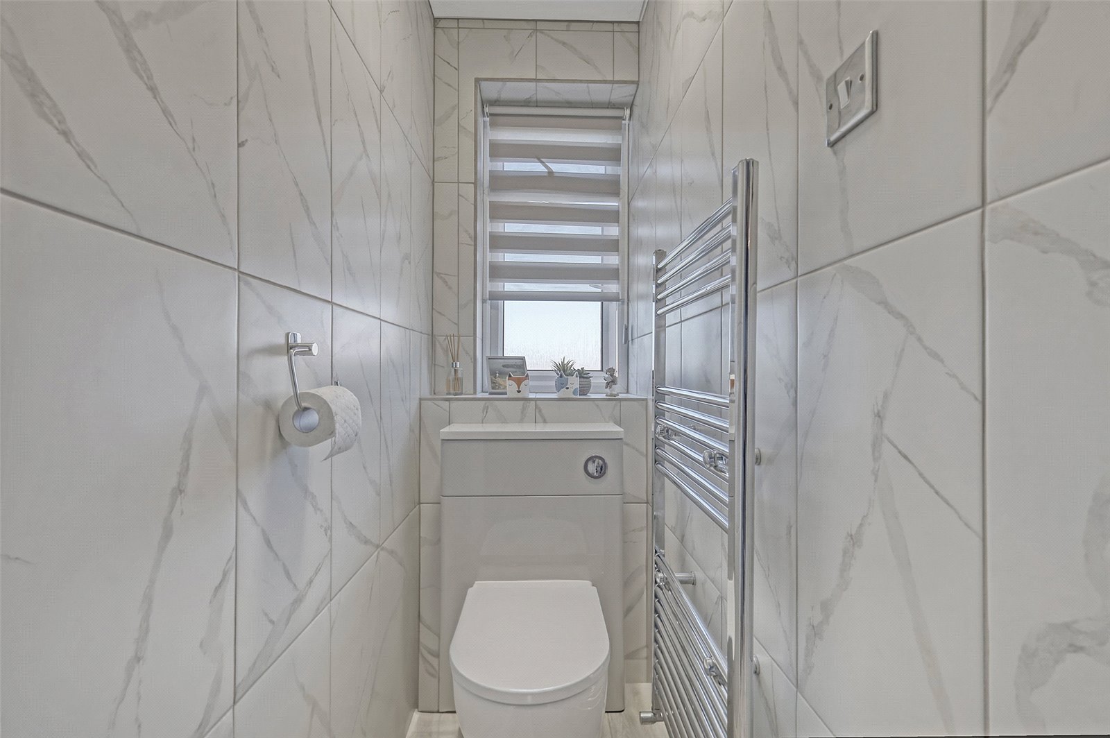 Upvc double glazed window to rear elevation with fanlight above, blind to remain, suite comprising WC concealed within a high gloss cabinet with push button WC flush, smooth plastered ceiling with halogen ceiling light (to remain), fully tiled walls, wall hung chrome ladder radiator, LVT flooring.