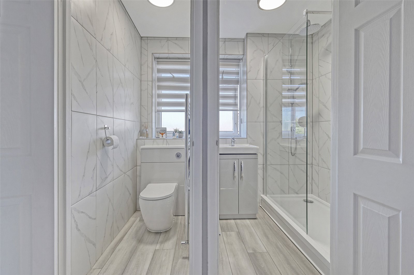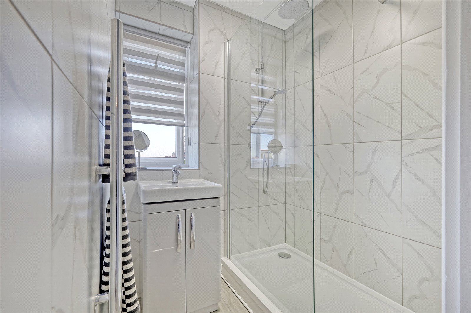 Upvc double glazed window to rear elevation with fanlight above, blind to remain, suite comprising white ceramic vanity wash hand basin with chrome mixer tap and pop up waste set into a high gloss cabinet incorporating shelving, full sized shower cubicle with ceramic tray and clear glass screen, rainfall and handheld shower attachments, shower bar mixer tap, smooth plastered ceiling with halogen ceiling light (to remain), fully tiled walls, wall hung chrome ladder radiator, LVT flooring.