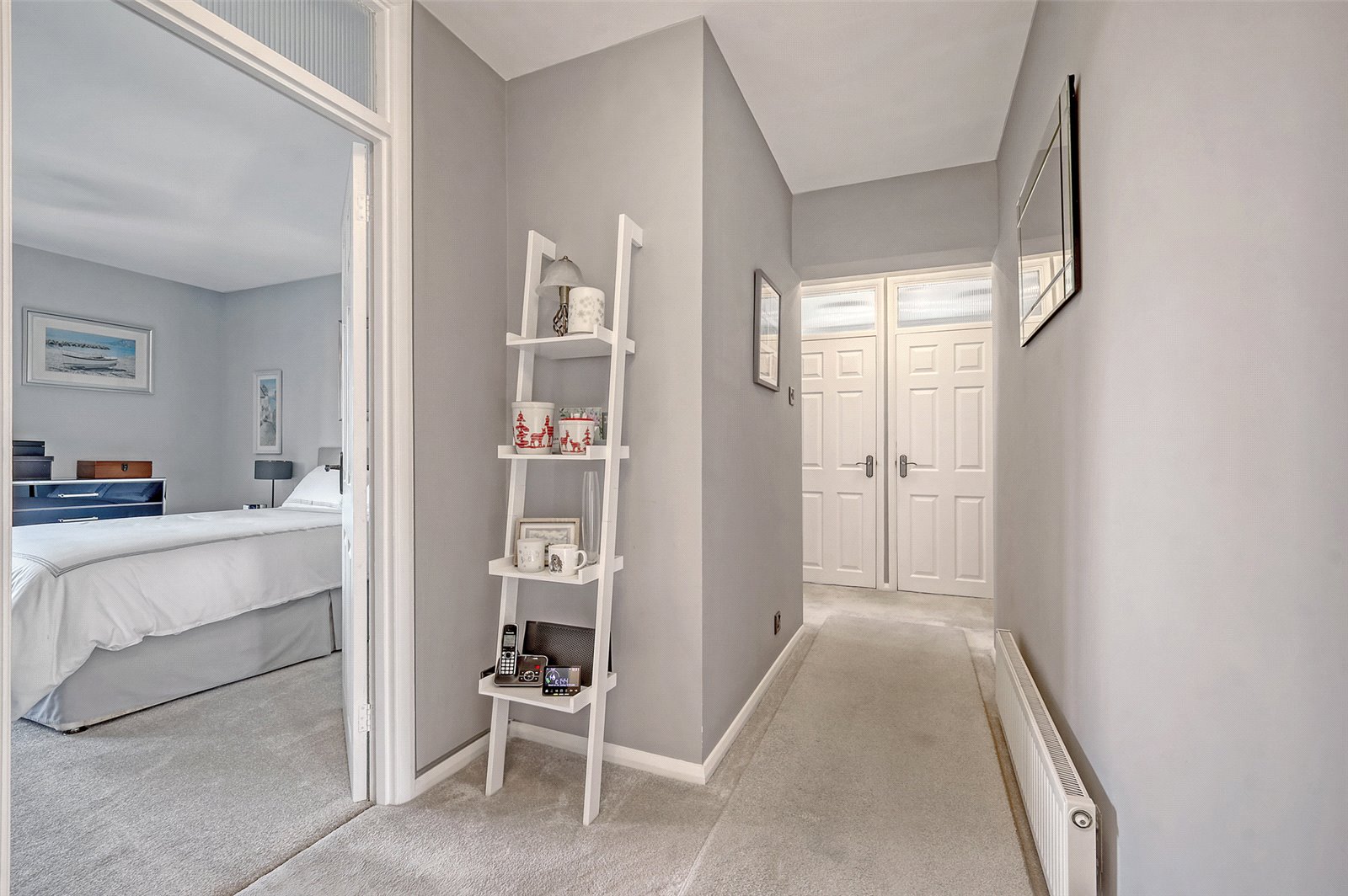 Smooth plastered ceiling, double radiator, entry phone, built in storage cupboard housing gas/electric meters with cupboard above, further built in storage cupboard with cupboard above, two halogen ceiling lights (light fittings to remain), fully fitted carpet, doors to all rooms.