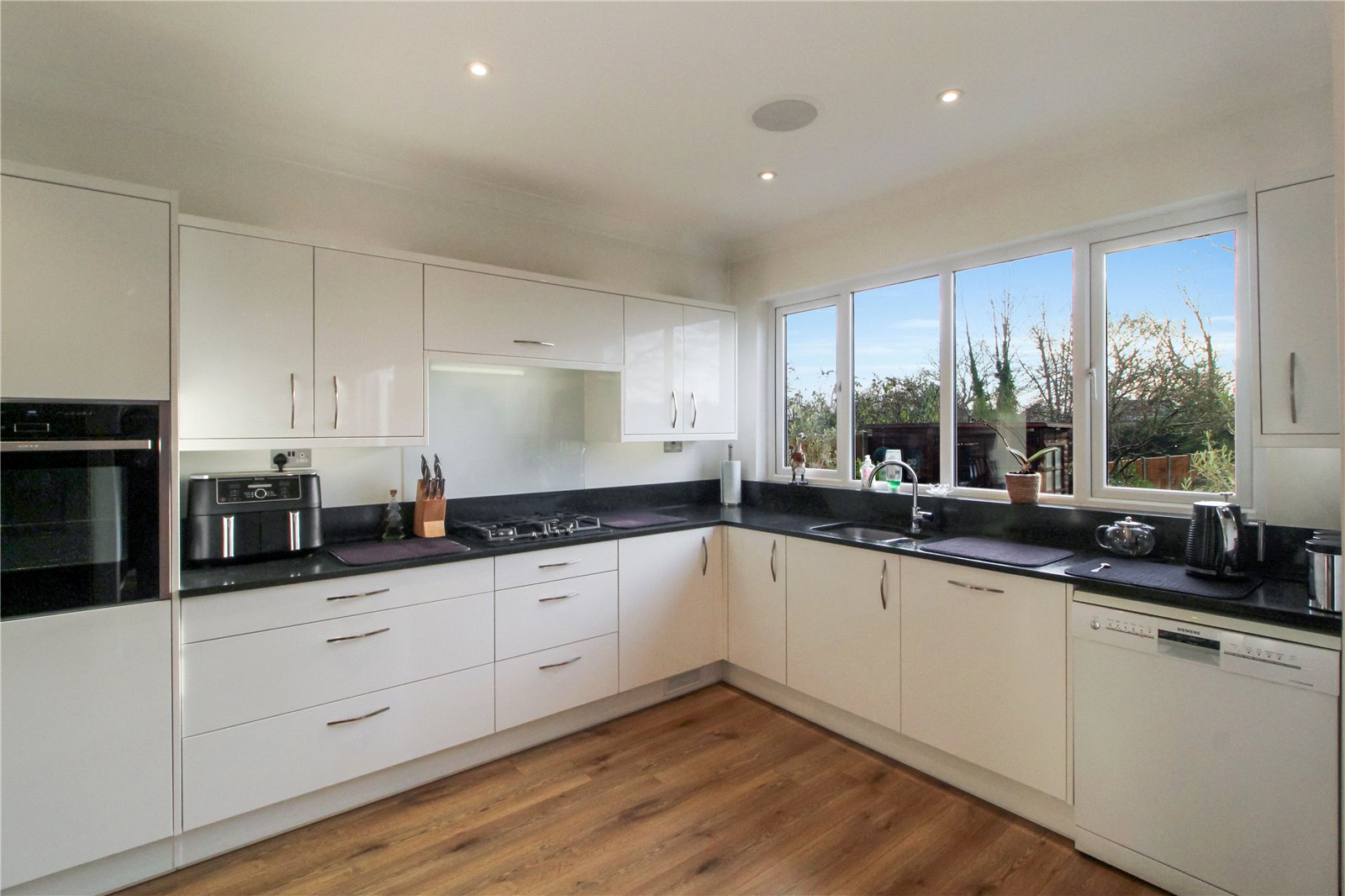 Modern fitted kitchen with a range of eye and base level units, built in speakers, spotlights to ceiling, built in oven and hob, space for dishwasher, space for American style fridge freezer, sink with drainer unit, wooden floor, double glazed window to rear, semi open plan to: